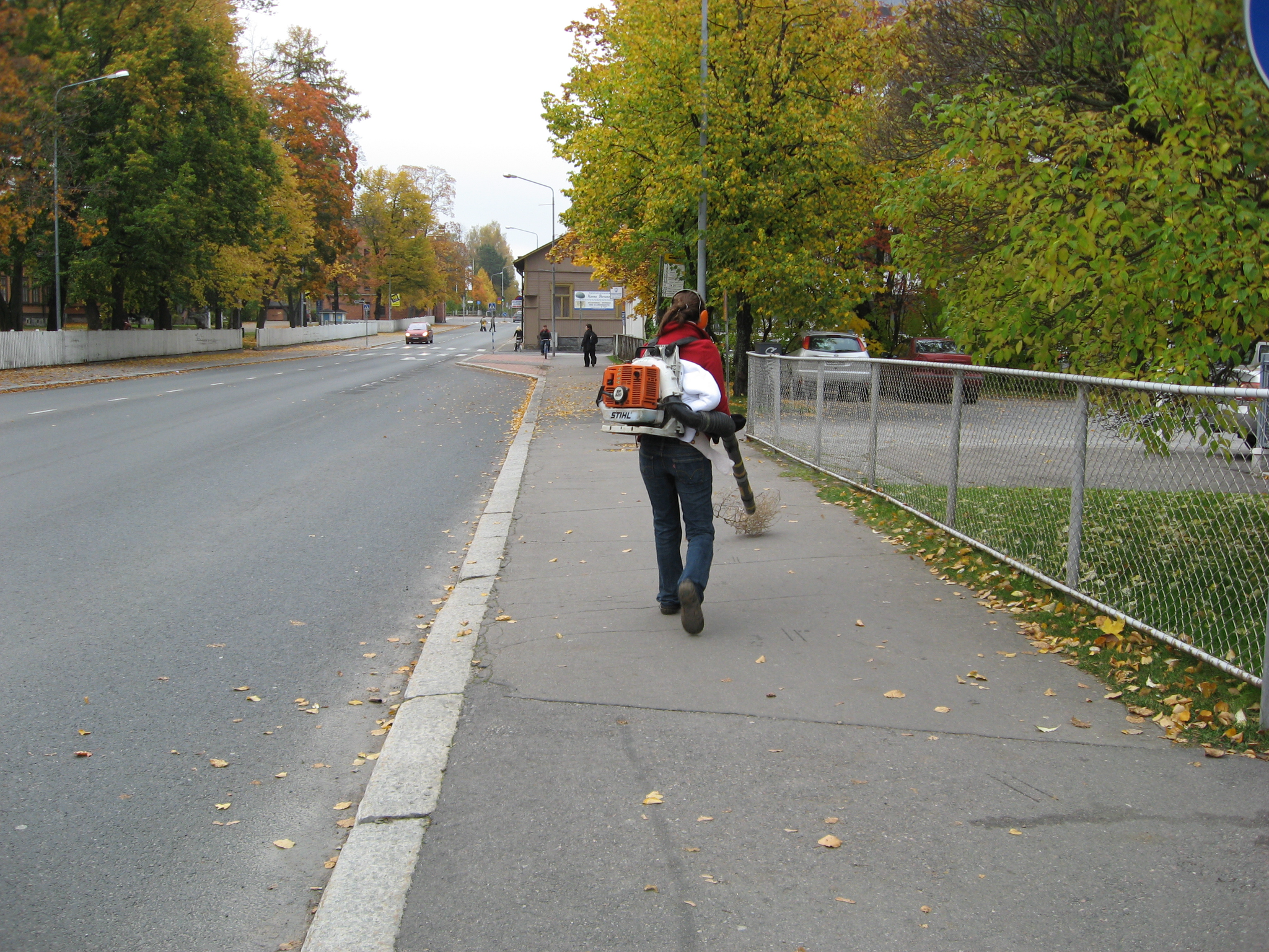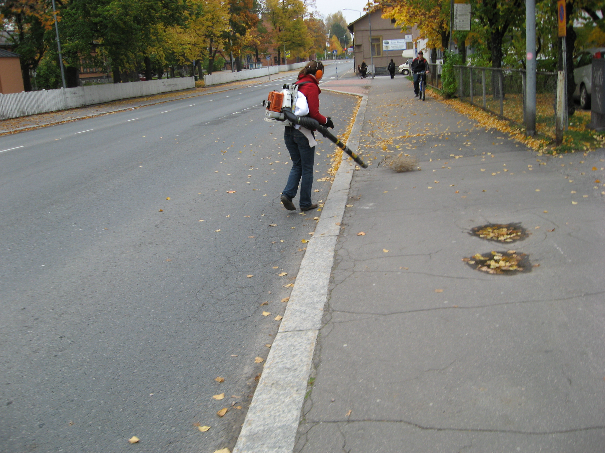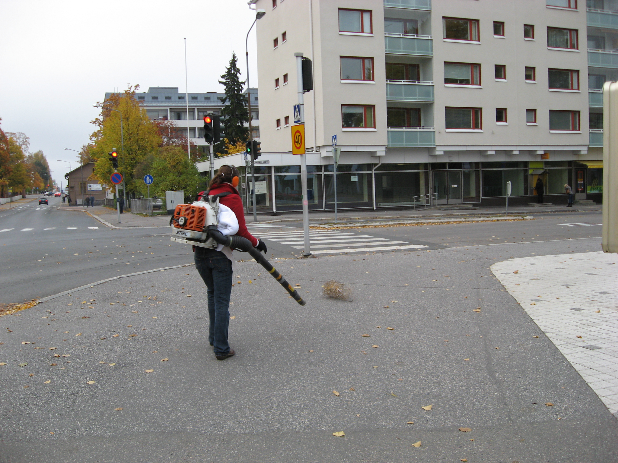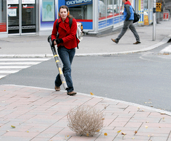 Lähtökohdiltaan toisenlainen on Clare Blundell Jonesin teos Tumbleweed. Siinä hallittava, seurattava ja ohjattava on kasvi. Taiteilija ”kävelyttää” arokierijää kannettavan lehtipuhaltimen avulla pitkin katuja.(96) Teoksen kaksi erilaista luonnetta tulee hyvin esiin. Tuulettomalla säällä teoksesta välittyy humoristinen, leikkisä puoli, mutta epävakaisella, myrskyisällä säällä esiin nousee epätoivoinen yritys hallita jotakin hallitsematonta. Jones kertoo löytäneensä netistä arokierijöitä myyviä yrityksiä ja tämän olleen alkutilanne teokselle. Vierasperäinen, karujen maisemien, lännenelokuvien kasvi juoksuttaa ohjaajaansa, ohjattavasta tulee ohjaaja ja kone työvälineenä menettää voimansa. Lehtipuhaltimen melu herättää huomiota kadulla kulkiessa, mutta pyörivää kasvia ei välttämättä heti huomaa. Vieraantumisen ja yksityisyyden kuvaukset kiinnostavat tekijää ja hän kuvaakin lehtienpuhaltajan hahmoa yksinäiseksi kulkijaksi. Äänekkään koneen ja kuivan, kuolleen kasvin välinen suhde on outo.(97)