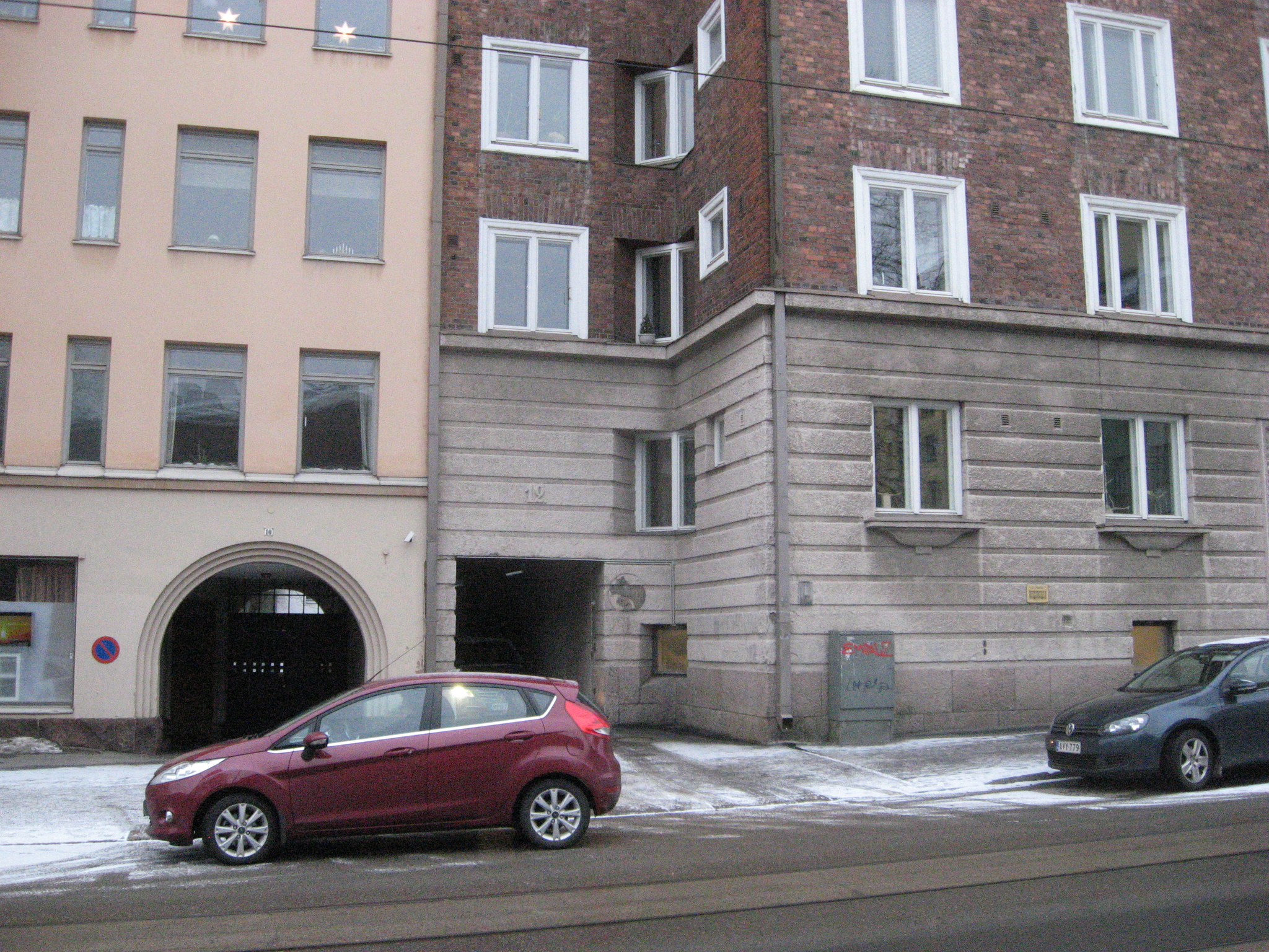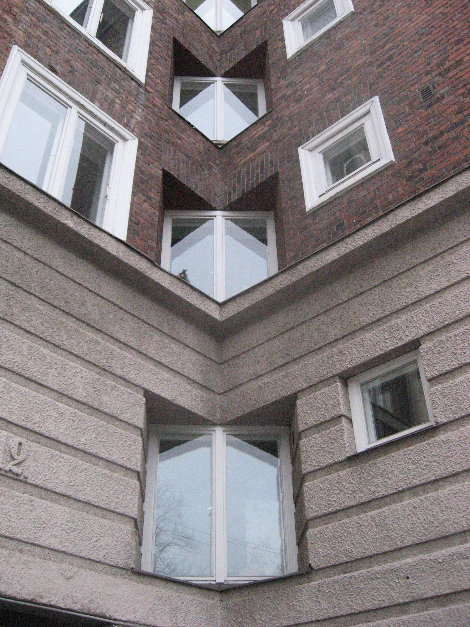 Kuvittele kaksi suoraa A ja B, jotka lähestyvät ja leikaavat toisensa kohtisuoraan. Syntyy suora kulma. Suorille määritellään pisteet a ja b, jotka ovat yhtä etäällä kulmasta. Nyt näiden pisteiden kautta piirretään suora C. Näin syntyy tasasivuinen kolmio. Kävelen Arkadiankadulla Etu-Töölössä, ohitan Luonnontieteellisen museon ja lähellä kadun toisella puolella Arkadiankatu 12:ssa on syvennys talon punatiilisessä julkisivussa ja siinä on porttikonki, josta käy kulku sisäpihalle. Ylempänä julkisivun sisennys tarjoaa suoran C kaltaisen ikkunaseinän. Tarkemmin sanoen tässä suora C leikkaa suoria A ja B. Asuintalo on rakennettu 1920- luvulla, se on tyyliltään pelkistettyä klassismia, jossa kivijalka on harmaata kiveä. Etu-Töölö sai asemakaavan 1910-luvulla. Se poikkesi perinteisestä ruutukaavasta kallioisen maaperän johdosta. (kuvaryhmä 20)