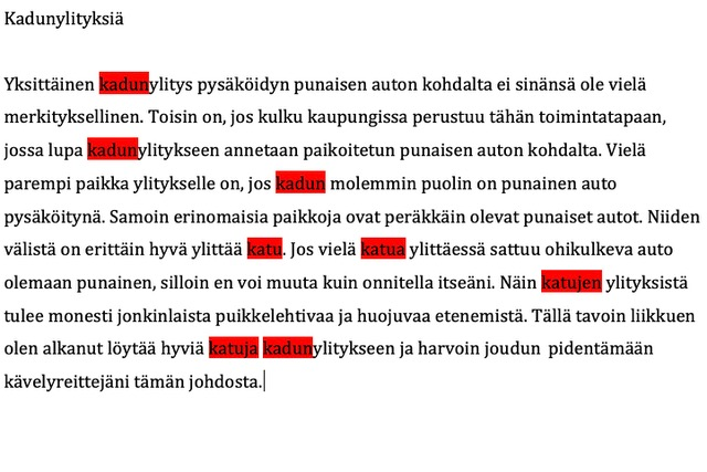 Yksittäinen kadunylitys pysäköidyn punaisen auton kohdalta ei sinänsä ole vielä merkityksellinen. Toisin on, jos kulku kaupungissa perustuu tähän toimintatapaan, jossa lupa kadunylitykseen annetaan paikoitetun punaisen auton kohdalta. Vielä parempi paikka ylitykselle on, jos kadun molemmin puolin on punainen auto pysäköitynä. Samoin erinomaisia paikkoja ovat peräkkäin olevat punaiset autot. Niiden välistä on erittäin hyvä ylittää katu. Jos vielä katua ylittäessä sattuu ohikulkeva auto olemaan punainen, silloin en voi muuta kuin onnitella itseäni. Näin katujen ylityksistä tulee monesti jonkinlaista puikkelehtivaa ja huojuvaa etenemistä. Tällä tavoin liikkuen olen alkanut löytää hyviä katuja kadunylitykseen ja harvoin joudun pidentämään kävelyreittejäni tämän johdosta (viiva kulkee tekstin välissä vaihtaen riviä punaisten merkkien kohdalla tai sitten jätän näin).