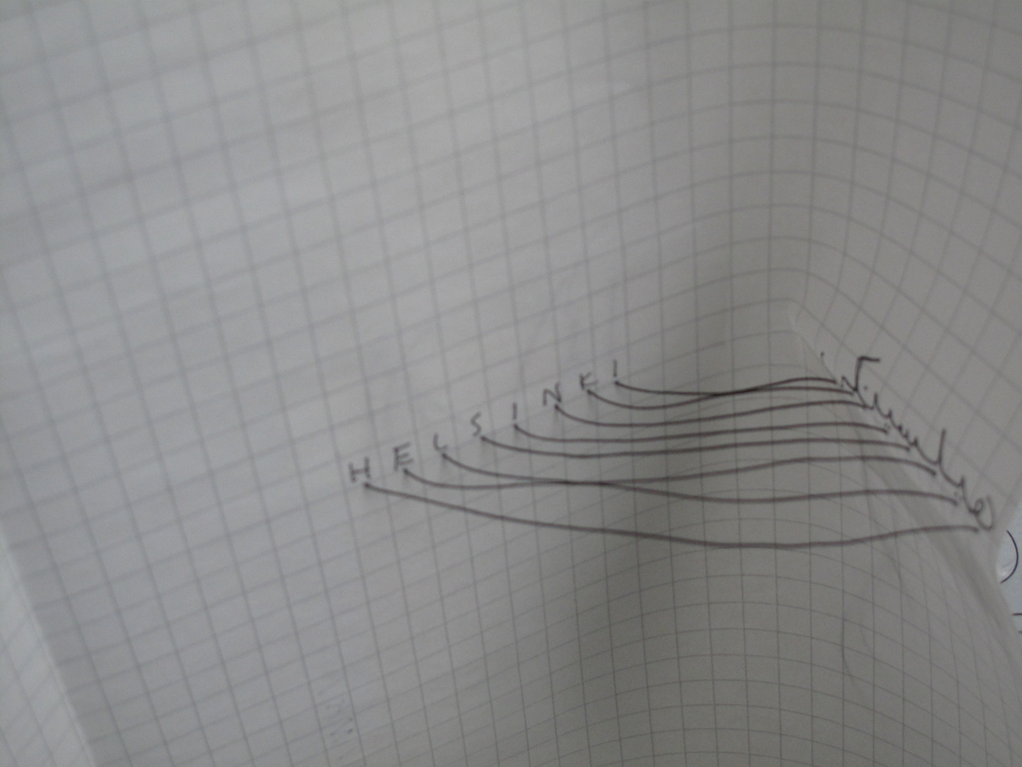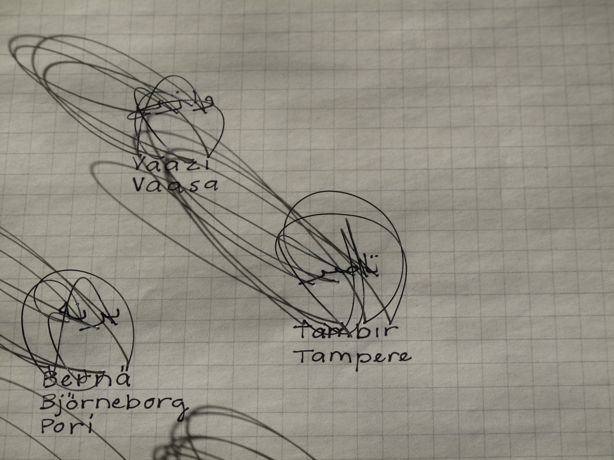 Kirjoitusharjoituksia -osio koostuu kahdesta osasta. Toisessa osassa ruutupaperiarkille kirjatuista kaupunkien nimistä, jotka kartansivun lailla osoittavat sijaintia. Etäisyys ei tuo hallintaa, mutta se auttaa hahmottamaan. Etäisyyden päästä on helpompi nähdä kokonaisuus. Mietin tuota jatkuvaa mittakaavojen sovittamista sellaisena, jossa ruumiillinen subjekti hakee paikkaa. Mittakaava tuo esiin lukuisten pintojen tai alustojen käytön teoksessa. Mittakaavaa käytän asettautumisen keinona. Suhteuttamalla mittakaavoja tarkastellaan ulkopuolelta etäisyyttä tunnistaen.