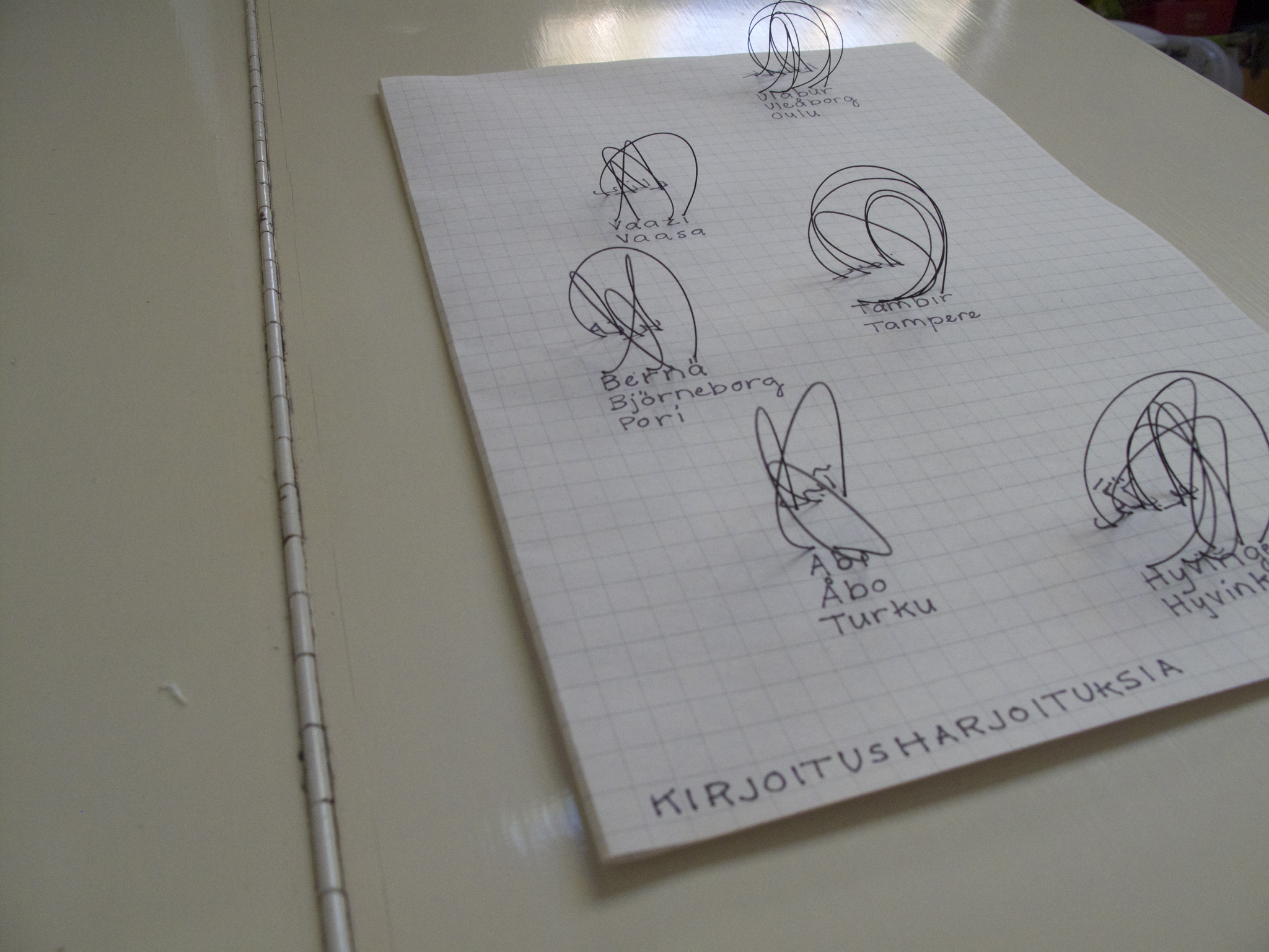Olen aivan liian lähellä, onko se ylös vai alas, soikiosta, pienestä pyöreästä lähtee kulku alas. Ensiksi se hieman nousee, tekee mutkan ja kaareutuu kuitenkin pian edeten alaspäin. Tämä on m-kirjain. Mutta alaspäin, se minua hämmentää. Onko se alaspäin äskeisestä paikasta, kun kehää ei vielä ollut tehtykään vai nyt kun seison tässä kehän linjalla. Minä siis seison kirjaimen päällä, aivan konkreettisesti, tai tässä tapauksessa voin sanoa, että aivan kirjaimellisesti seison kirjaimen päällä. Nyt keksin, minä olen siis jättiläinen ja tuolta ylhäältä, juuri tuolta männyn oksalta katselen tänne alas ja sieltä huudan ohjeita. Haa, nyt tiedän, minne alaspäin suuntautuu. Ole rauhassa, minä neuvon, olen kuin olisin lintunen täällä oksalla. Täältä ylhäältä näen kaiken ja voin hyvin seurata touhujasi siellä alhaalla. Tässä vaiheessa on hyvä ottaa lintu mukaan tarinaan.