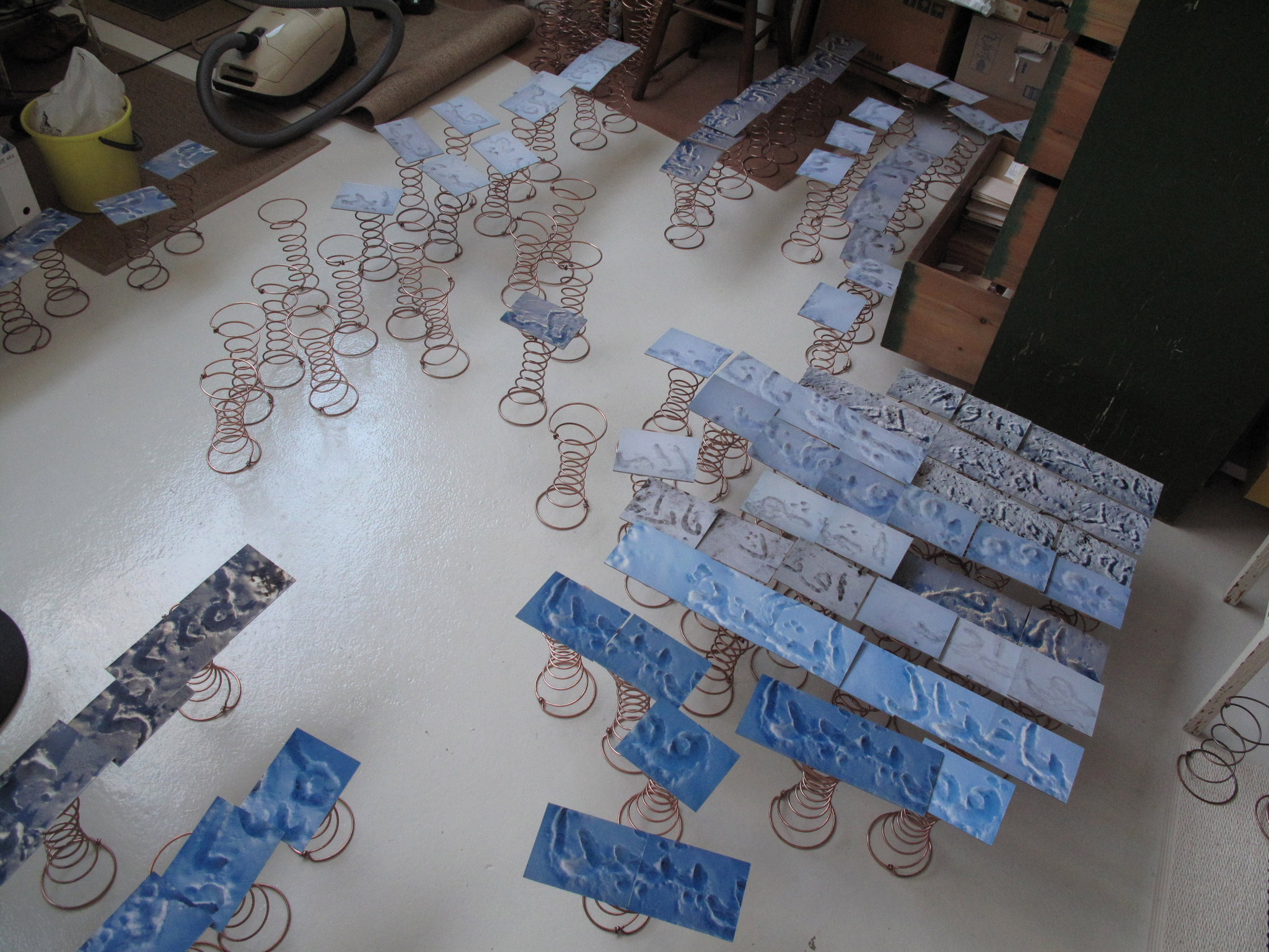 Tällä kaikella yritän tuoda esiin tekemisen paikan ja teoksen esittämisen paikan keskinäisen suhteen ja riippuvuuden. Teoksen tasolla tämä näkyy pyrkimyksenä näyttää tehdyn työn lisäksi tekeminen. Teko tapahtumana, ja näin päädyn ajatukseen valokuvien esittämisestä jousien avulla niiden toimiessa valokuvien jalustoina. Tällöin ne ehdottavat liikkeen, painalluksen anatomian. Valokuvaa pitää auttaa ja tämä auttamistapahtuma on näiden jousien tehtävä. Ei niin, etten luottaisi valokuvan kykyyn toistaa, näyttää nähty. Mutta valokuva enemmänkin osoittaa työn tuloksen ja viittaa pysähdykseen.