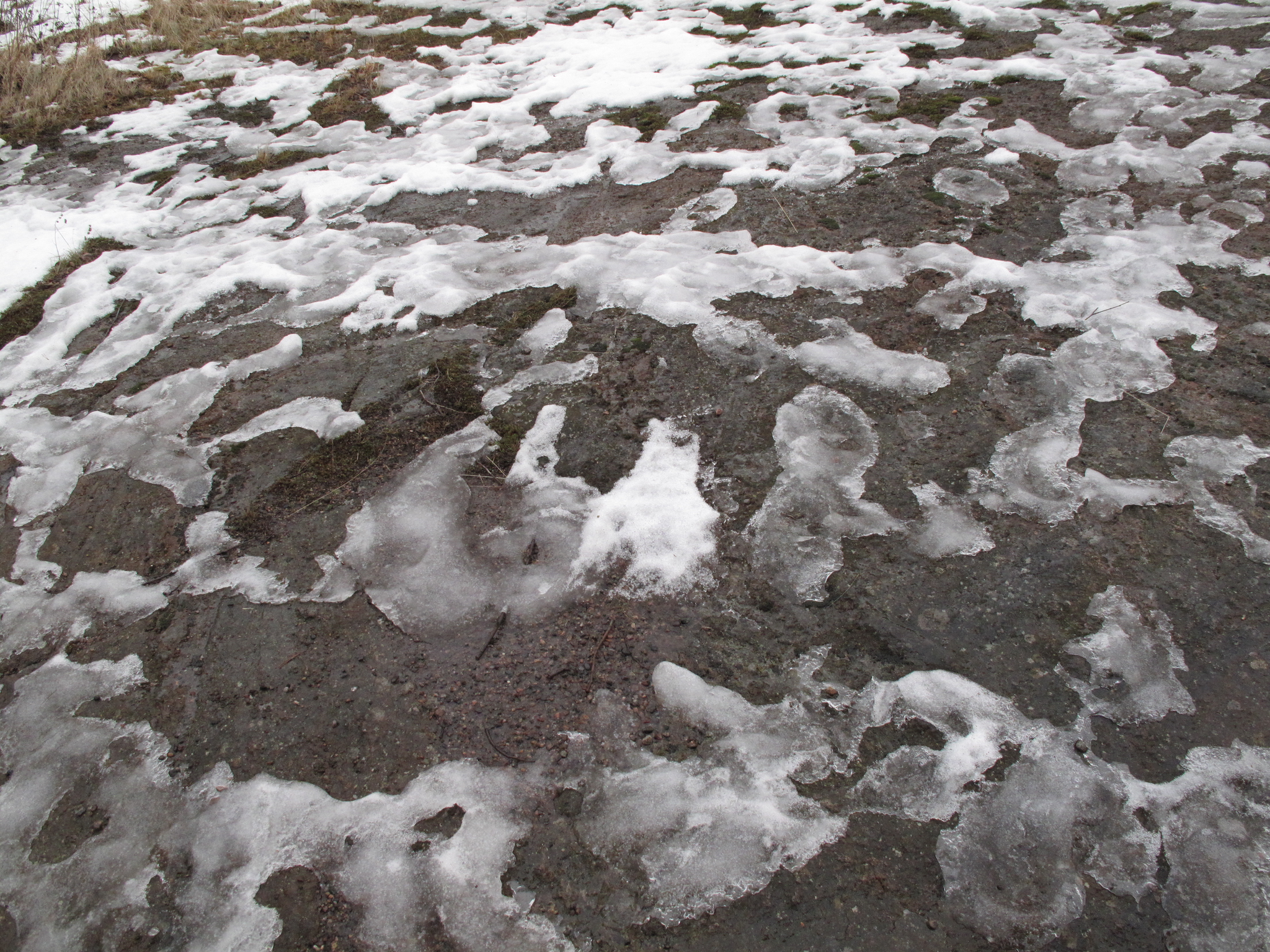 Ei teiden, kävelyteiden varsille voi tehdä, koska ne aurataan tai ne on jo aurattu, kun saavun. Seuraavaksi kokeilen kallioilla koulupihan lähistöllä. Se on kuin veisi lapselta karkkipussin. Ei pidä lasten kanssa kilpailla lumisista rinteistä. Keksin paikan, läheisen kallioisen kukkulan Hallainvuoren ennen Viikkiä, lähellä kotia. Kaltevalla lumisella rinteellä ei niin vaan astella, lumi luisuu, minä luisun ja kuvaaminenkaan ei onnistu. Maisema on liian monimuotoista, ei mahdu sana, tavu tai kaksi. Päivä kuluu etsien painalluskohtia lumisessa rinteessä. Kaksi sanaa tänään ja eilen yksi, tällä tahdilla yksi talvi ei riitä. Lopulta kylmyys on se, joka määrää paikan. Pihapiirissä ja vesitornin juurella, ylhäällä rinteellä, tien toisella puolella, on paras paikka.