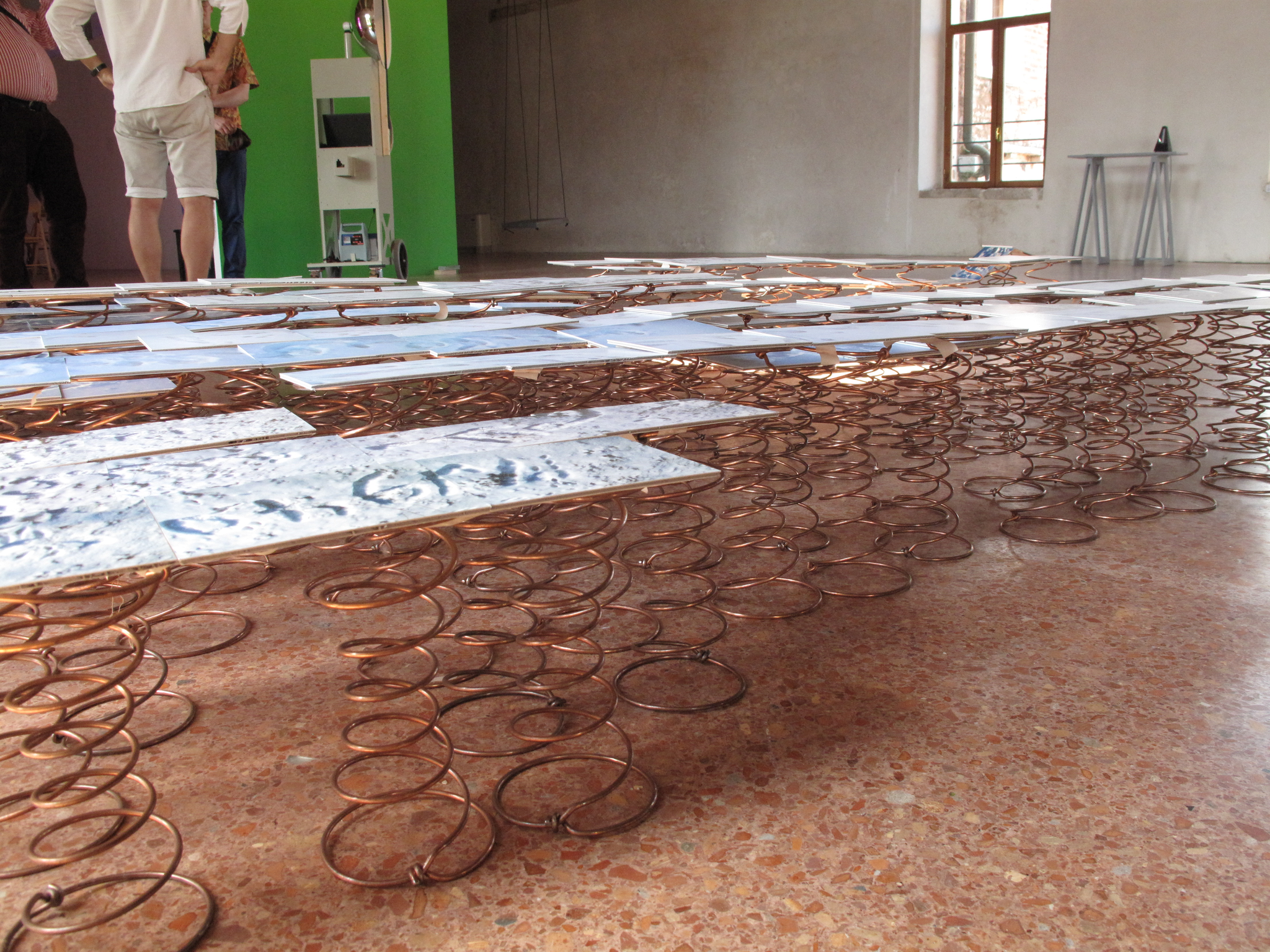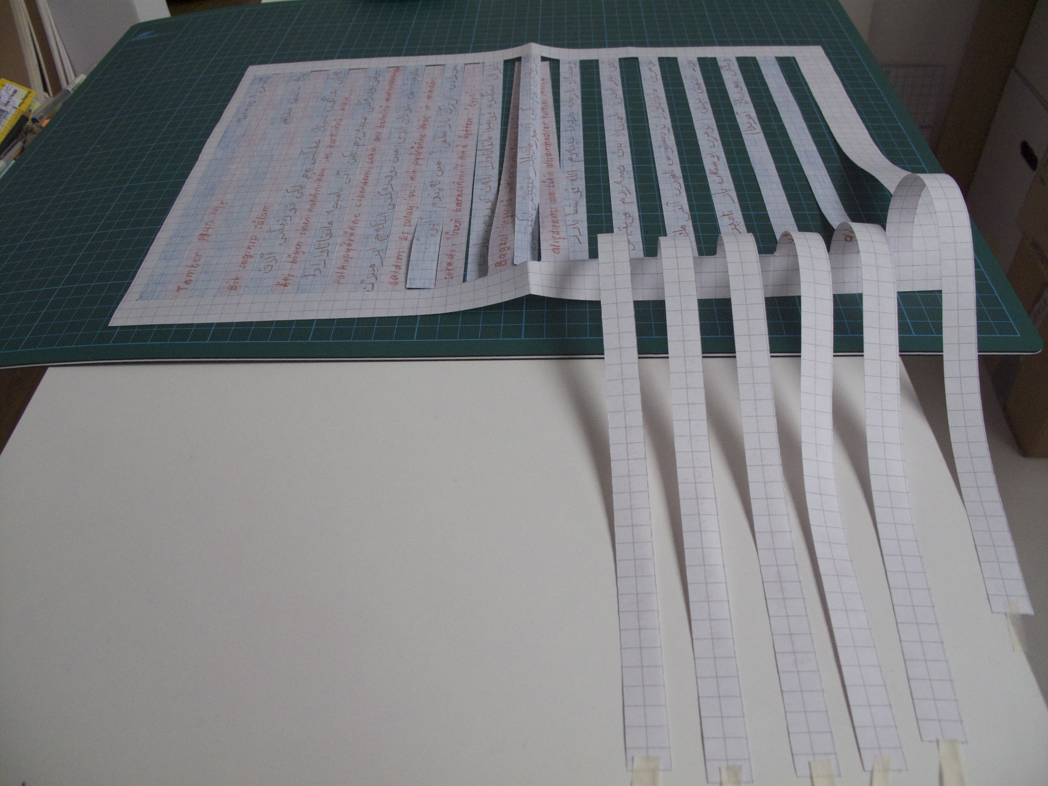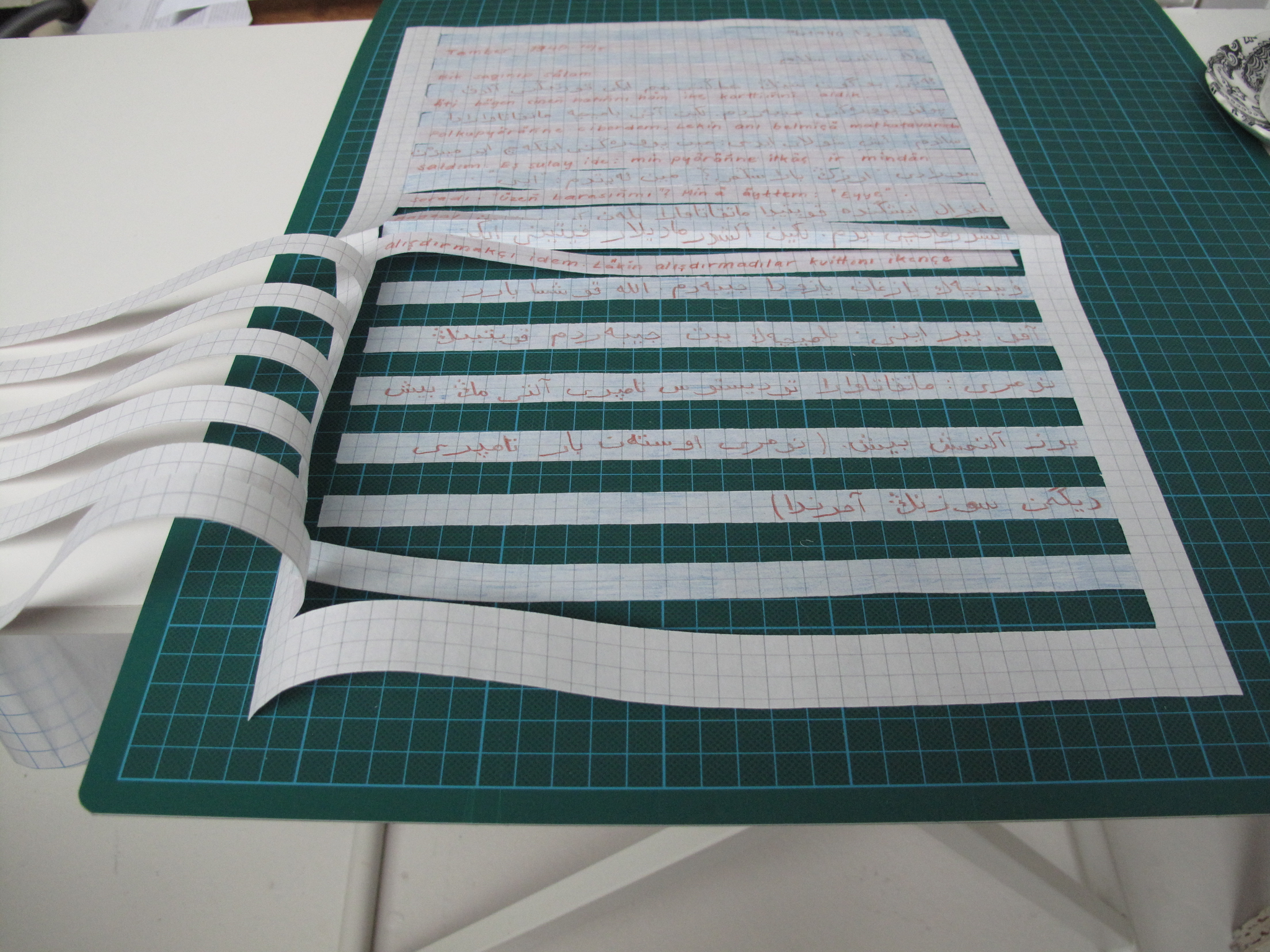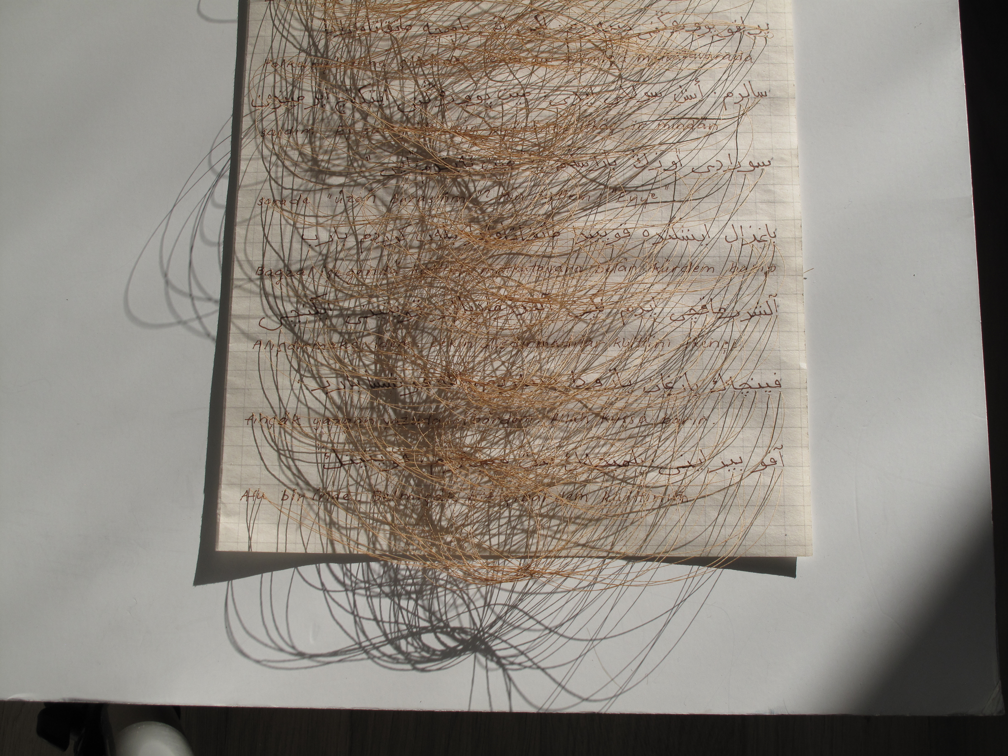 Ensimmäisen rivin kirjoitus alkaa oikealta arabialaisilla kirjain merkeillä, toinen rivi vasemmalta latinalaisilla kirjain merkeillä. Yhdistän ohuella paperilangalla vastaavat kirjain merkit toisiinsa. Rivien keskivaiheilla langat ovat lyhimmillään, koska nyt vastaavat kirjainmerkit ovat lähellä toisiaan. Aivan kuin langalla yhteen liitetyt eri kirjainmerkit tiivistäisivät tässä suhteitaan. Tämä taas tuo mieleen perhosen siivet, risteilevät langat siipien värähtelyinä tai sitten vain karvoja paperin pinnalla. Näin vapaasti laskeutuva lanka muotoutuu kirjainmerkiksi paperin pinnalle. Jossakin kohtaa kirjain merkkien vastaavuus ei toimi, silloin arabialaisten kirjain merkkien kohdalta puuttuu vokaali.(126)