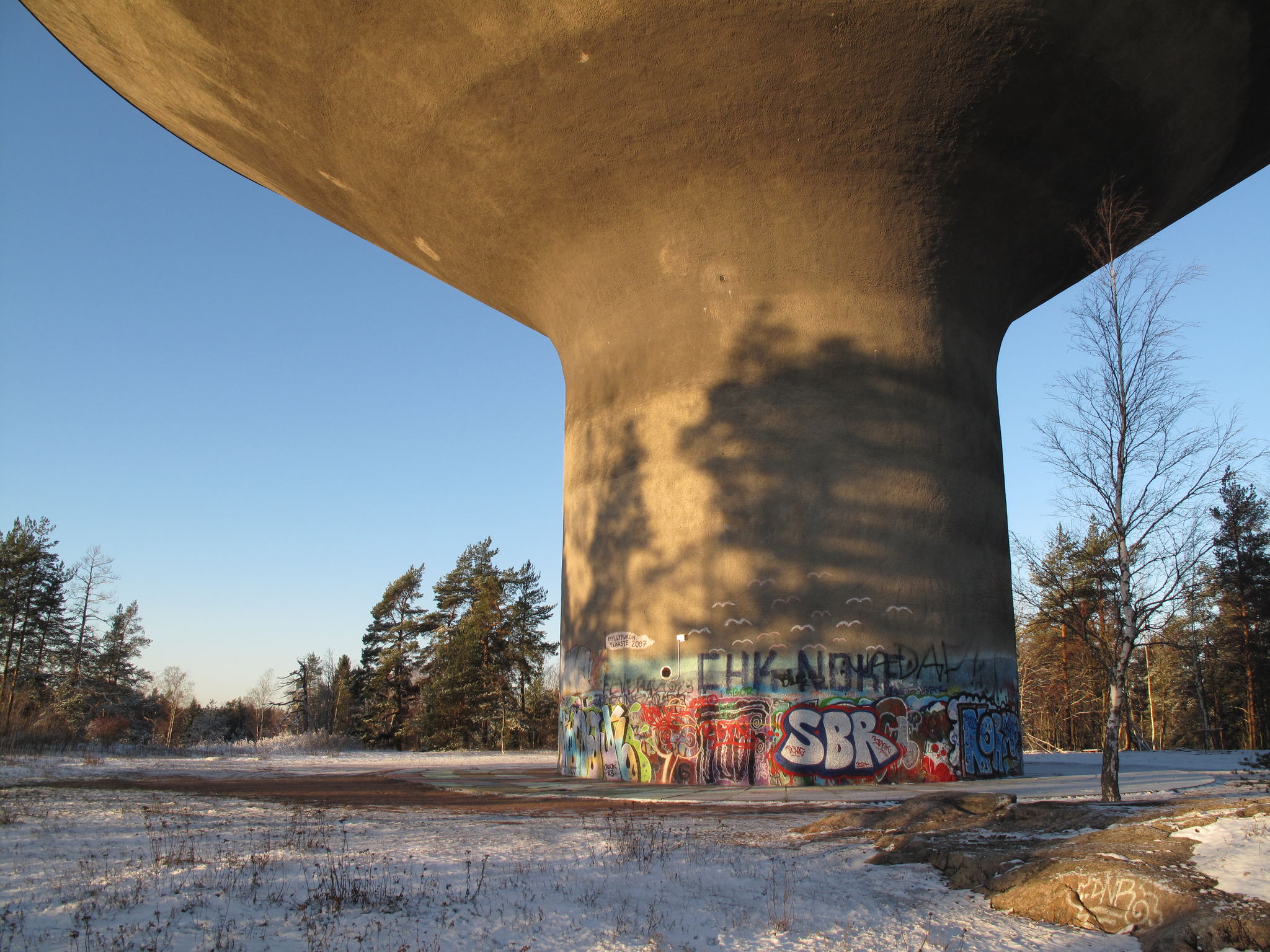 Vesitorni hallitsee maisemaa, betoninen järkäle ylhäällä kallioisella rinteellä. Se on sellainen, jonka vieressä kaikki muu näyttää pieneltä ja jotenkin säyseältä. Maltillinen uusi pientaloalue reunustaa rinnettä.