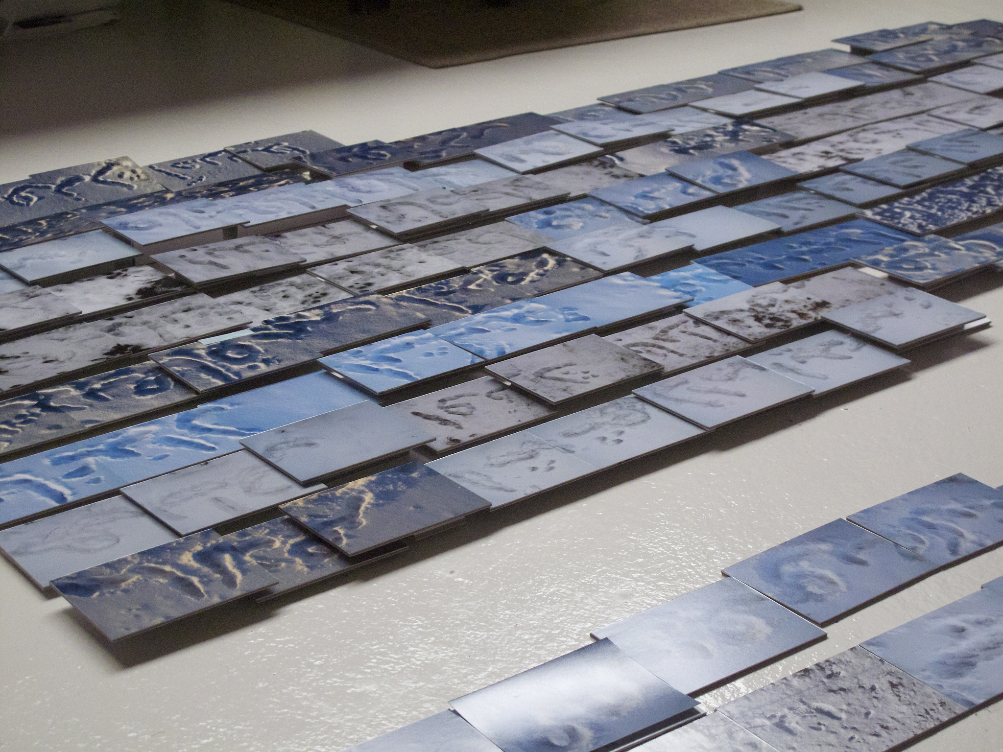 Pakkanen kiristyy, kameran muistikortti ei toimi ja turhaudun tarpomiseen. Mutta työskentely muuttuu selkeämmäksi; tasainen rinne vesitornin juuressa, lause tai kaksi päivässä. Pukemista, riisumista, lämmittelyä, edellispäivän kuvien purkamista muistikortista, kuvien valitsemista ja yhdistämistä. Ihmettelen järjestelmällisyyttä, toimenpiteitä, jotka seuraavat toisiaan ja niiden mahdollistumisen edellytys on aina aikaisemmin tehty työ. Ja kaikki tämä taas on riippuvainen sääolosuhteista, joihin koko ajan opin paremmin valmistautumaan. Talvityöskentelystä tulee säännöllisten toimien jatkumoa ja kuvarivit työhuoneen lattialla alkavat täyttyä. Paikallistun maisemaan olosuhteiden kautta, asemoin sijaintini rinteellä auringon mukaan.