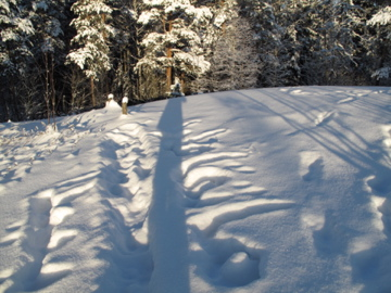 Nousu rinteelle polkua pitkin alkaa loivasti vähän piilosta, tallattujen lumikasojen seasta. Sitten jyrkempi nousu, jota loivasti kaartava polku myötäilee, ja jonka varrella kasvaa nuoria mäntyjä. Yksi niistä on jyrkimmän ponnistuspaikan kohdalla, hyvänä kaiteena jäisellä mäellä. Etenen ylhäällä rinteellä, kunnes toinen polku halkaisee kulun johtaen vesitornin juurelle. Aurinko paistaa suoraan kasvoihin, käännyn ja varjoni ulottuu melkein rinteen reunustalla kasvavaan kuusen juureen. Huomioin kohdan, sillä tämä osoittaa kirjoituksen suunnan. Tästä kohdasta tarkistan kirjainmerkkien sijainnin olevan samalla suoralla.