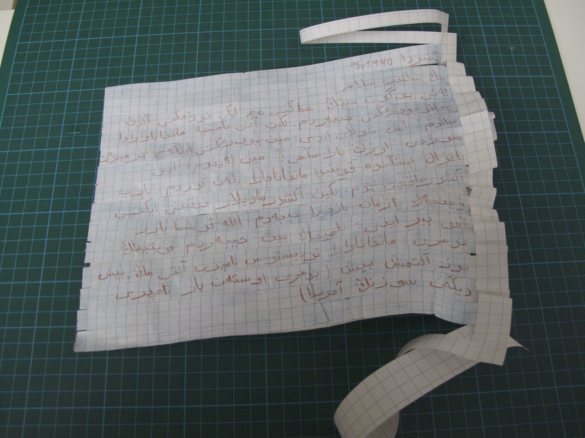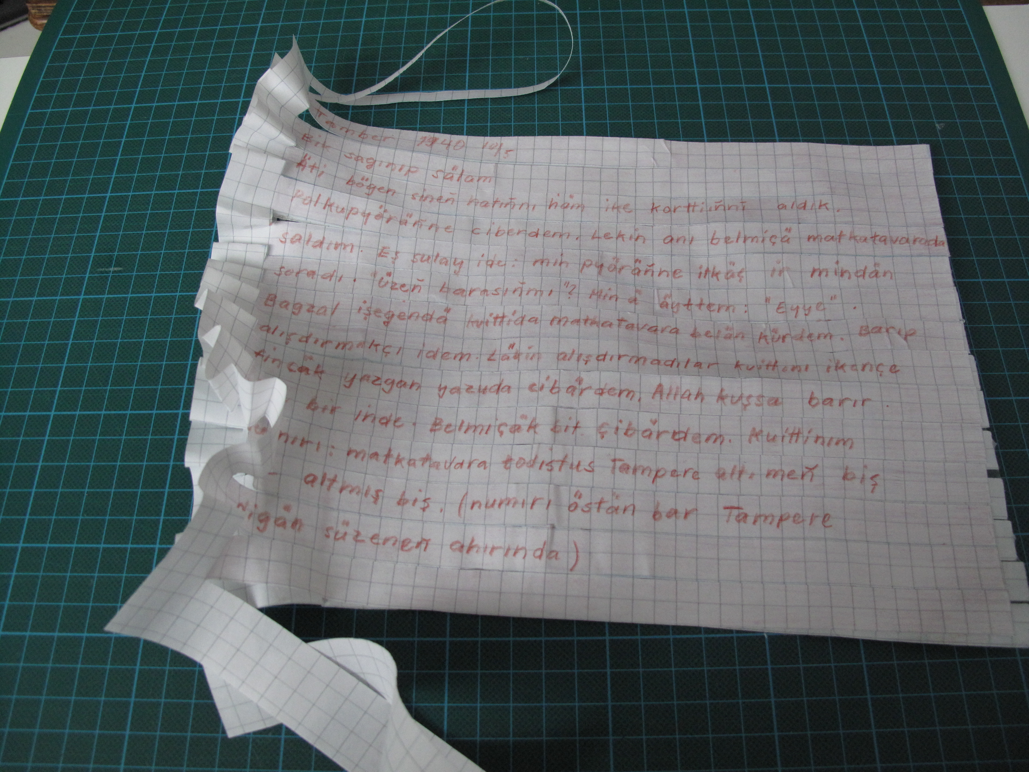 Ruskea, pehmeäksi kulunut, vanha kirjekuori, isoisän papereita - isä näyttää. Huolellisesti säilytettyjä hauraita asiakirjoja, taitokset avattu ja jostakin sivut ovat jo repeytyneet. Melkein läpikuultavia paperiarkkeja, paikoin kirjoituskoneen lyöntien läpäisemiä kirjainaukkoja. Selaan varovaisesti paperikasaa: polkupyörän rekisteröintitodistuksia useampi kappale, virkatodistuksia, kulkulupa Viroon, kulkukauppiaslupatodistuksia kaupankäyntiin maaseudulla ja oikeuden asiakirja onnettomuudesta, jossa potkukelkka ja linja-auto ovat törmänneet. Tästä olen jotakin kuullut, hämäriä mielikuvia, miksi se oikeastaan onkaan jäänyt mieleen. Seuraava paperiarkki, revitty vihonsivu, ruutupaperi, jossa kirjoitusjälki on jo osittain hävinnyt ja muste levinnyt. Luen hitaasti, haparoiden, en pelkästään siksi, että kirjoitusjälki olisi epäselvää vaan enemmän siksi, etten käytä näitä kirjaimia juurikaan, sillä tataarin kieltä kirjoitettaessa enää ei käytetä arabialaisia kirjaimia. Lukemiseni on hidasta ja hapuilevaa.