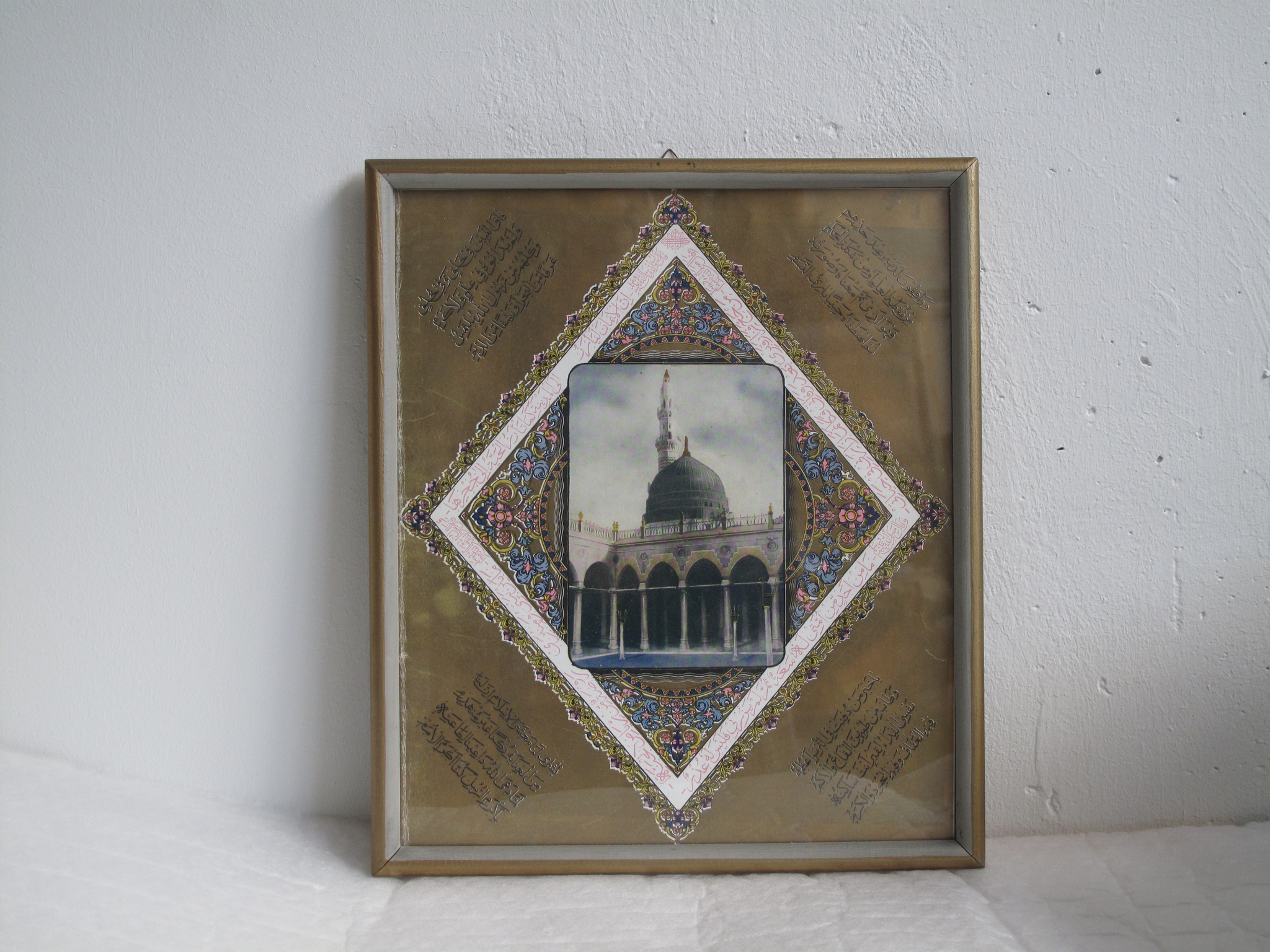 Vanhempieni makuuhuoneessa oli huoneentaulun kaltainen painettu kuva, jossa keskellä, kulmistaan pystyssä oli postikortin kokoinen kuva moskeijasta. Kuvan keskellä on kupoli, joka leikkautuu alhaalla kaariholvikäytäviin ja sen takana kapea minareettitorni rajautuen pilviä vasten. Postikortinkokoista kuvaa kehystää valkoinen reunus, joka on kulmistaan pystyssä. Reunuksen sisällä juoksee arabiankielinen teksti himmeänä. Lisäksi Koraanin tekstejä on sommiteltuna nurkkiin. Kehykset mukautuvat ruskean, kullansävyiseen pohjaan.