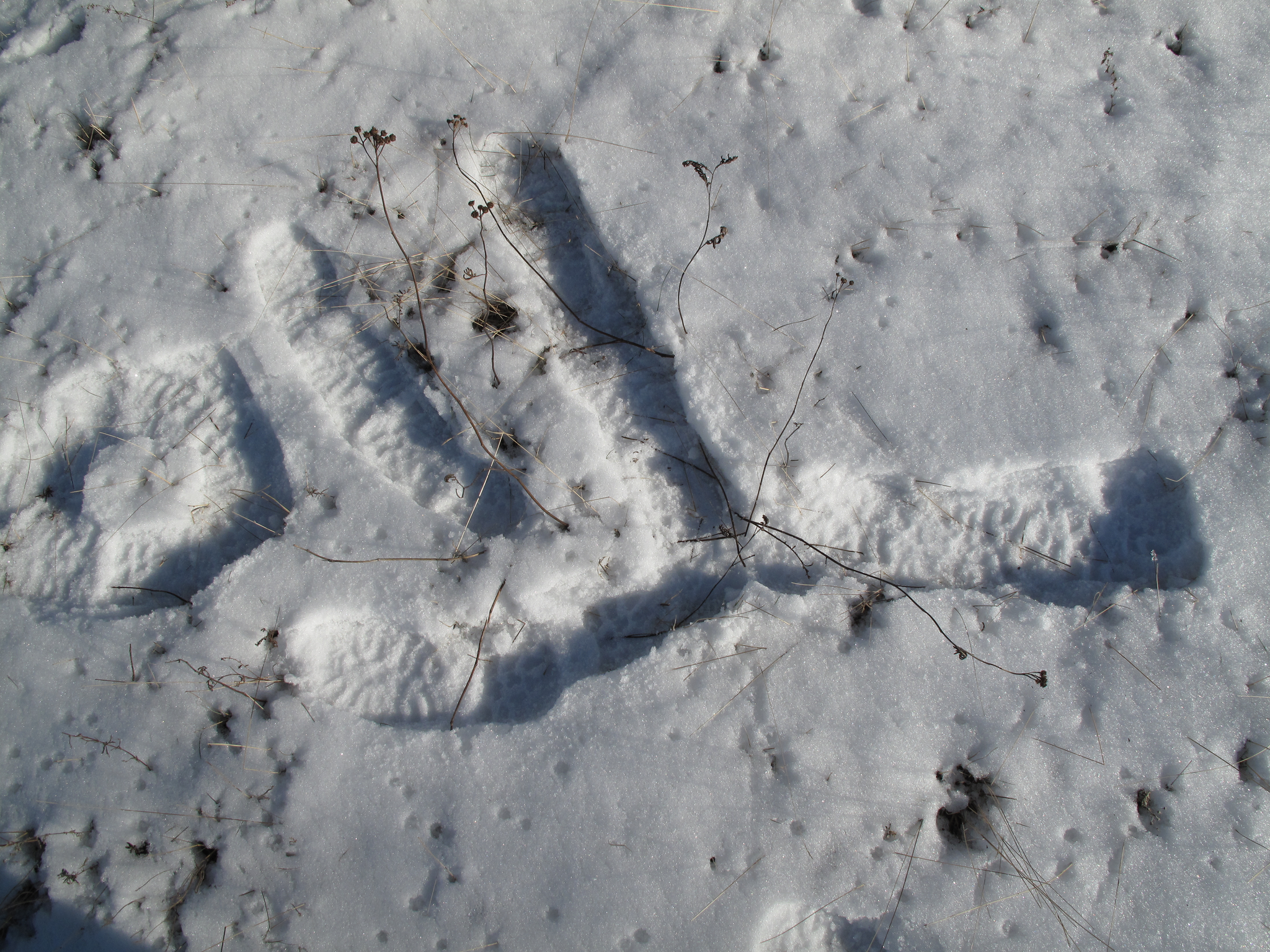 Tasapaino on menetetty, horjahdan, toinen jalka lipsahtaa lumeen ja siihen jää kolo. Mitäs nyt teet, onko kirjoitusjälki pilalla? Mutta jos jalka ehti laskeutua siihen, missä on jo jälki, ei hätää. Tämä kaikki saa minut tietoiseksi siitä, miten liikun lumessa ja ennen kaikkea, miten ylläpidän tasapainoa liikkuessa. Tarkoitus on, ettei turhia jälkiä jää lumeen, siis sellaisia, jotka eivät sisälly kirjainmerkintöihin. Olen kirjoittanut muistilappuun lauseen, jonka aion nyt toisintaa lumeen. Suklaan kansipahvi muistilappuna vasemmanpuoleisessa taskussa. Se on hyvä, siinä on taitokset valmiina, taskuun sopiva koko ja pahvinpalasta on helppo käsitellä tumput tai hansikkaat kädessä. Toisella kädellä pidän kameraa. Kylmyys tekee tarkaksi ja karsii turhat liikkeet.