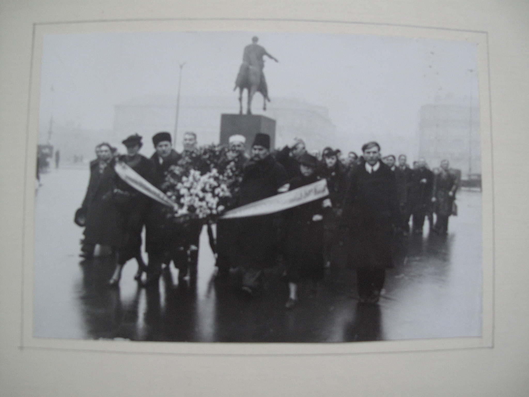 Valokuvassa väkiryhmä etenee kosteansumuista katua pitkin. Ajotie näyttää kiiltävältä, niin kuin vain sateen jäljiltä voi näyttää. Kulkueen etunenässä kaksi naista kantaa seppeleen muistonauhaa. Kuvassa näkyy, kuinka muistonauhan molemmat päät on erotettu toisistaan ja sitten huolellisesti keritty auki niin, että nauhan teksti on osittain näkyvissä. Kuvateksti kertoo muistonauhaan kirjoitetun tekstin: ”Idel-Uralin turkkilais-tataareilta Puolan itsenäisyystaistelun uhreille”.(118) Seppelettä kantaa kaksi miestä ja heidän rinnallaan muistonauhaa kantavat naiset. Kuvan reunalla tummina läikkinä on yksittäisiä ryhmiä katsomassa kulkuetta tai vain odottamassa kadun ylitystä kulkueen väistyttyä. Kuvassa ylhäällä keskellä näkyy ratsastajapatsas. Se leikkautuu esiin usvaista taivasta vasten. Muuten katunäkymä verhoutuu harmaaseen sumuun, josta kaukana erottuvat heikosti rakennusten ääriviivat. Kuvassa kulkue on jo ohittanut ratsastajapatsaan. Se näkyy takaa, viistosti oikealta päin niin, että ratsastajan toinen käsi on ojentautuneena suoraksi, ehkä pidellen miekkaa.