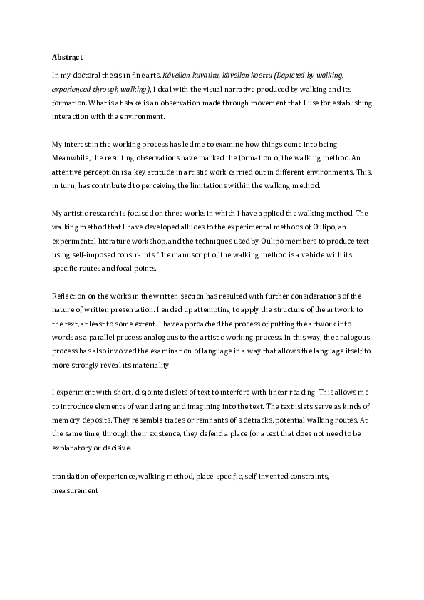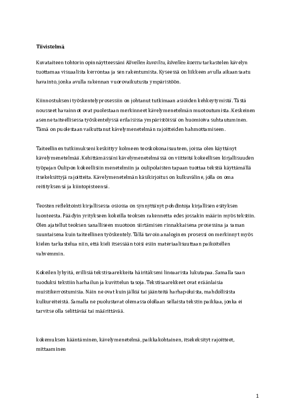 Taiteellinen tutkimukseni keskittyy kolmeen teoskokonaisuuteen, joissa olen käyttänyt kävelymenetelmää. Kehittämässäni kävelymenetelmässä on viitteitä kokeellisen kirjallisuuden työpajan Oulipon kokeellisiin menetelmiin ja oulipolaisten tapaan tuottaa tekstiä käyttämällä itsekeksittyjä rajoitteita. Kävelymenetelmän käsikirjoitus on kulkuväline, jolla on oma reitityksensä ja kiintopisteensä.