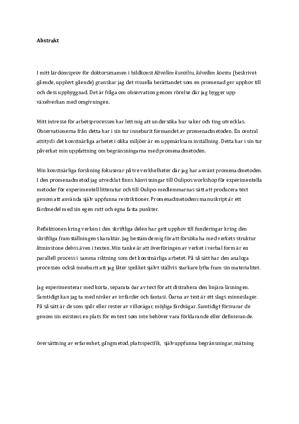 Kuvataiteen tohtorin opinnäytteessäni Kävellen kuvailtu, kävellen koettu tarkastelen kävelyn tuottamaa visuaalista kerrontaa ja sen rakentumista. Kyseessä on liikkeen avulla aikaansaatu havainto, jonka avulla rakennan vuorovaikutusta ympäristöön.