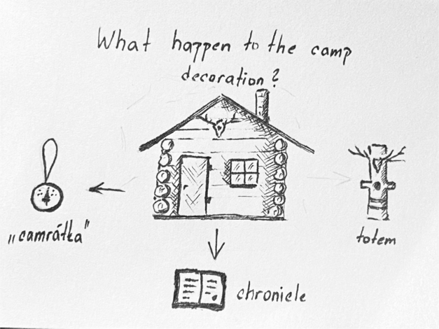 The main pillar of tramping became the construction of settlements. Wooden shelters or log cabins served as refuges and could be used by any tramp. They were built in forests, mostly among rocks, where they were well hidden and not easy to find, as their location was known only to the tramps. Each settlement was given a name, which could describe the landscape or be taken from the name of the settlement's founder. The settlers took care of them, regularly repairing and maintaining them in good condition. Tramps always behaved decently in the settlements, and after their visit, there was no trace of them in nature. They restocked the wood they used for fire, covered the fire pits with clay, and poured water on them to prevent fires. They were very kind to each other and to the forest. The settlements also have their own chronicle, where everyone could sign that they had visited. Various stories and anecdotes from their travels are also written in the chronicles. It therefore serves as a non-transferable diary that does not belong to a person but to a place. The chronicle also describes its founding and is decorated with various talismans and drawings. It is the pride of the entire settlement. The camps were also decorated with so-called camrátko, small pieces of wood that were painted on. They served as souvenirs from various events, most often from the annual bonfire. In the past, the settlement was a sacred place where, upon joining, an oath was sworn on the settlement knife. New members had to undergo a trial period ceremony, which included, for example, lighting a fire with a single match.