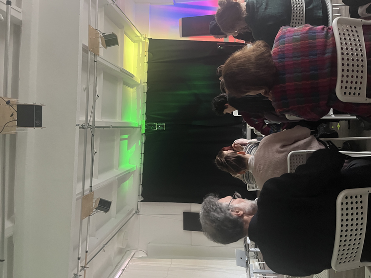 Our improvisation held a significant place in the program and required careful consideration. It was only after ensuring the spatial setup was functioning optimally that we could begin exploring how to position ourselves for the improvisation. This positioning is crucial: sitting in the center of the room allows us to monitor the spatialization more effectively, but it also occupies the best listening spots, which might otherwise be reserved for the audience. As such, a compromise is often necessary, although it can impact how well we hear one another and, consequently, how effectively we interact spatially during the performance. I have previously discussed some of these challenges in Lacroix (2022) in the context of mixed music, but many of the same issues apply here.
