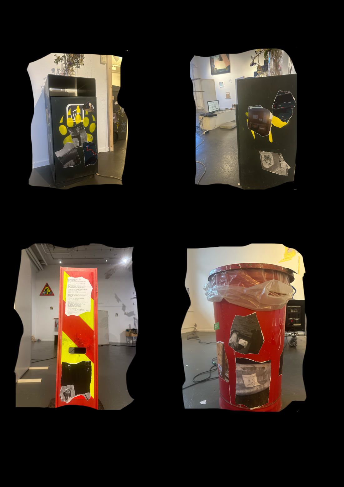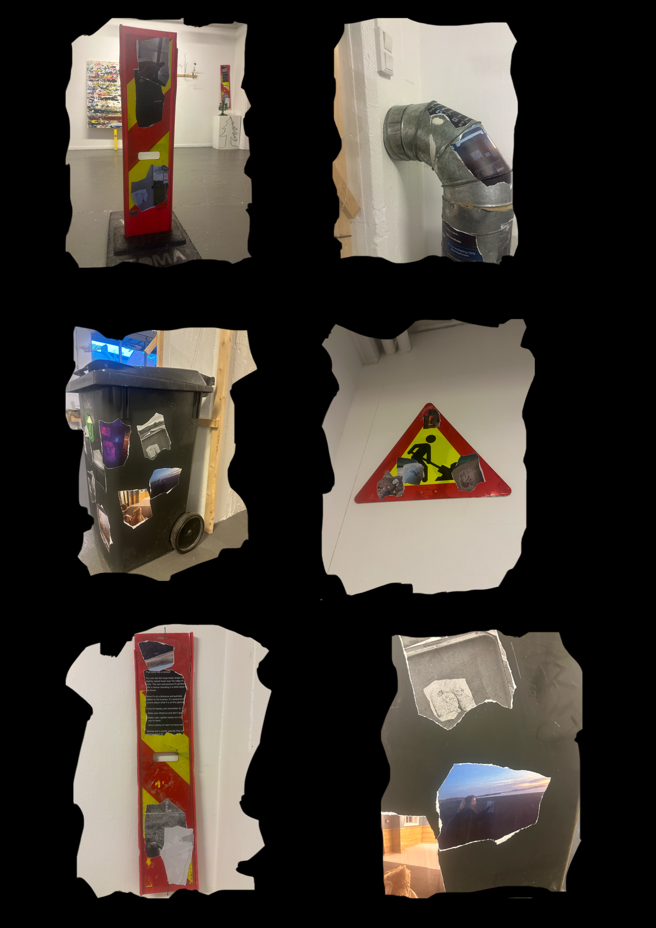For this exhibition, I chose not to display final drawings/posters, but instead I focused on the documentation of the process, photos taken throughout my small travels for the project. I brought urban objects from the outside, such as trash cans, street signs, and more… I brought these objects into the gallery space and wheat-pasted my torn photographic prints onto them, using the same paper and technique as my original posters outside. The photographs depicted situations, landscapes, route maps, moments like meals and breaks and photos of myself installing the work outside.