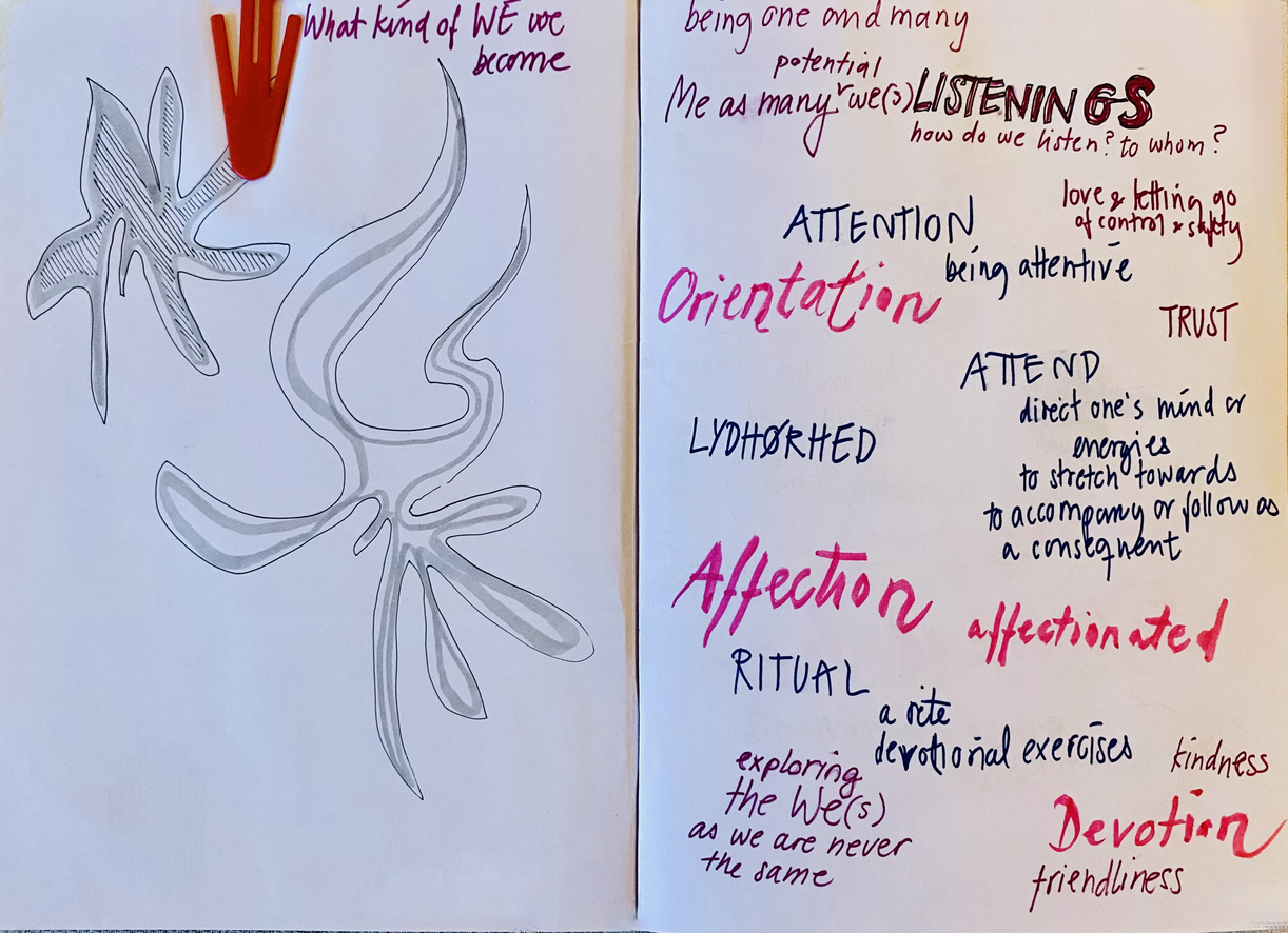 Dramaturgy cannot be fully prescribed or pre-determined. It emerges in the interplay of bodies, materials, and contexts, often in surprising or unplanned ways. Rituals, gestures, and shared explorations arise through collective attention, improvisation, and responsiveness, producing temporal, material, and affective compositions that belong to the moment.