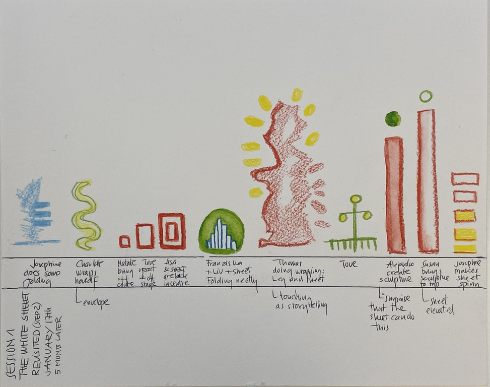 SESSION # 8 THE WHITE SHEET REVISITED. This garment we had jammed with the very first day, and wanted to revisit. The figures emerging, were distinct and clear. Some figures appears several times, as a result of actions that was repeating or eccoing preceeding actions (red rectangular boxes). Another figure that stood out is the fuígure with red wavy, vertical lines which was drawn as a response to a participant running fast, in circles thorugh the room for several rounds. The action created very much movement and in the sheet and the air around.