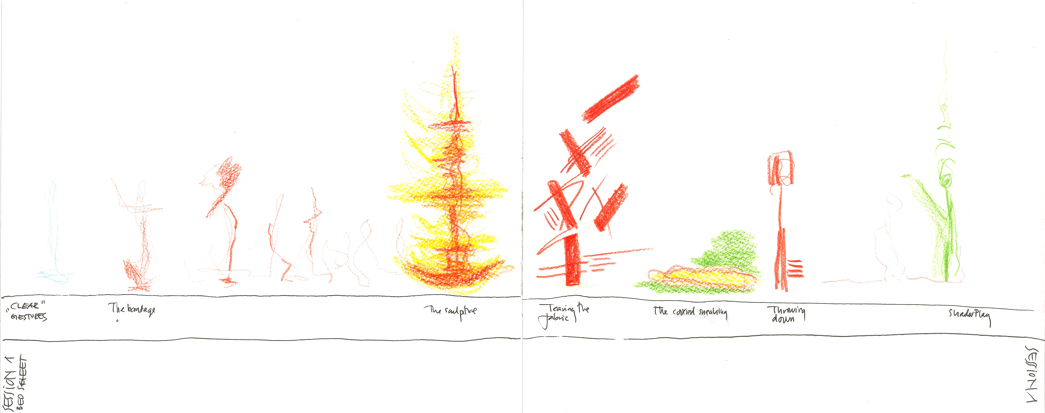This experiment of notating time-space events without words is not unique; it is found in the fields of music and dance. But in the field of costume design and scenography, it is not so common to use notation of the dramaturgy based on visual signs.