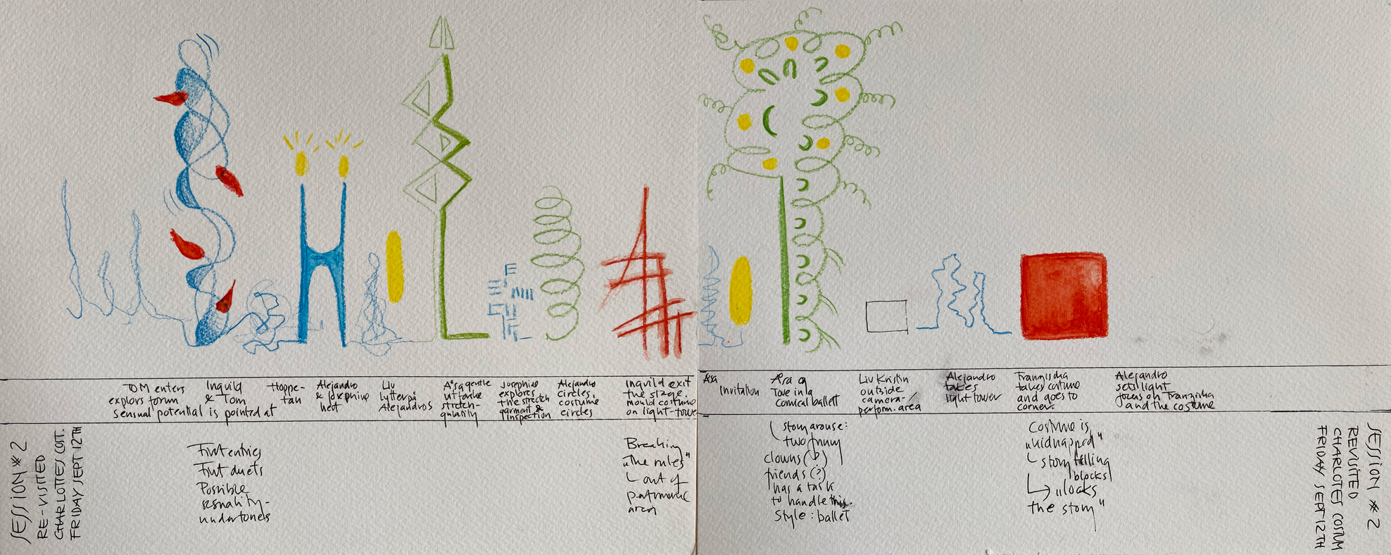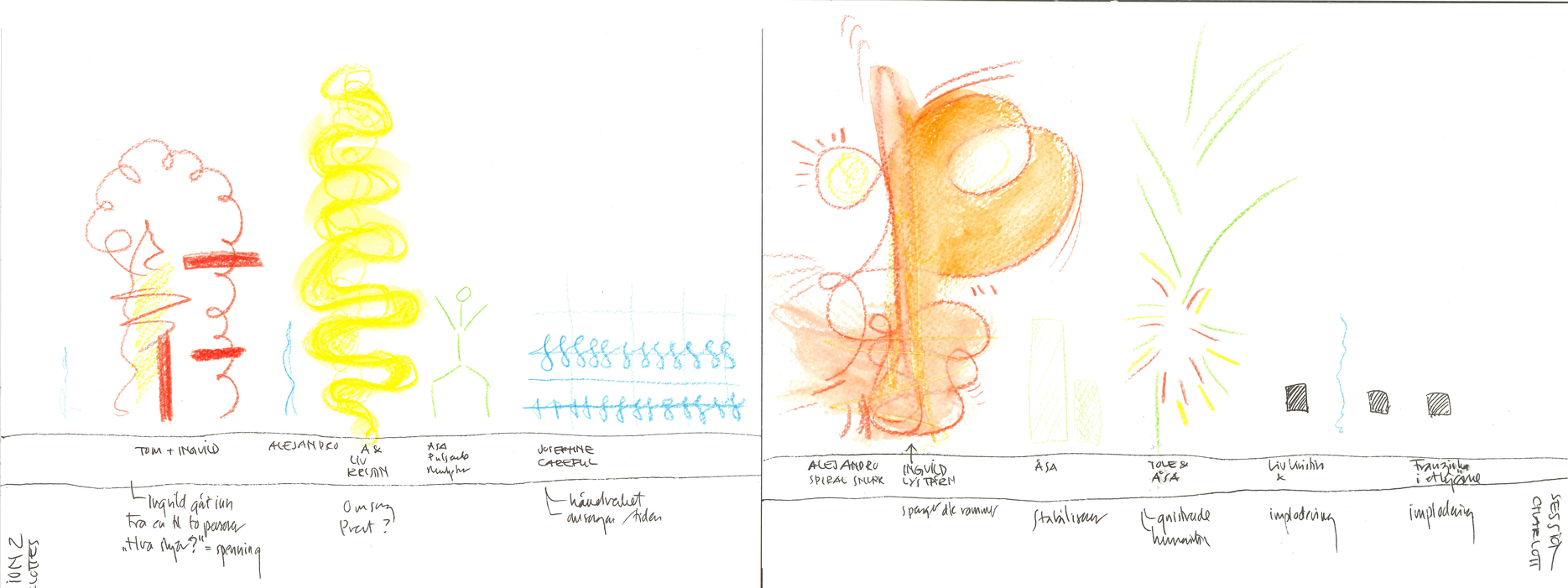 The method can be used in several phases of creating a devised performance, such as registering the improvised sessions, discovering structures, and helping organize and compose with elements. A challenge here can be collaborative work, where several people must co-create, as the visual, abstract language of the figures can challenge communication. On the other hand, this can also strengthen the possibility of communicating, as the language does not prioritize wordy descriptions. During the workshop, in the group discussions that followed the costume jam sessions, the group members responded to my drawings. It was interesting for me to hear from them that the notation captured the actions in a very specific and precise manner.