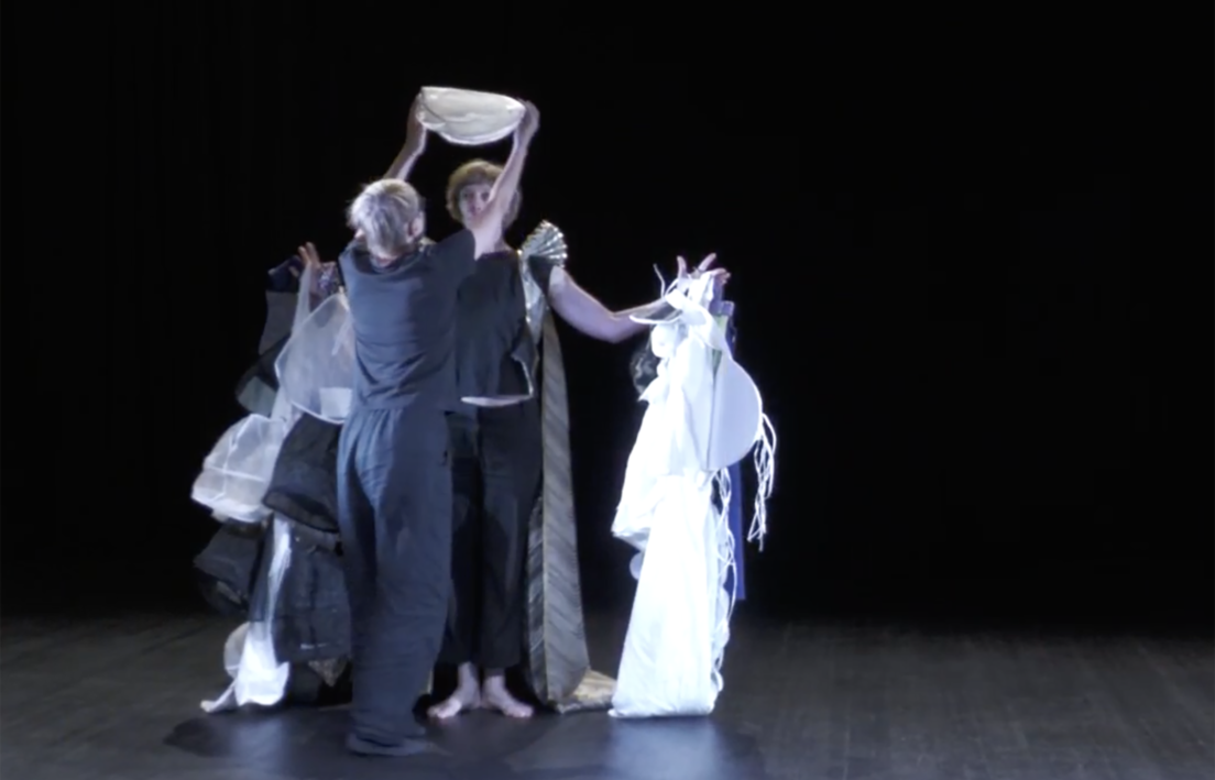 By researching performance emerging from costume, my curiosity now goes to the dramaturgy that emerges. In general terms, I understand dramaturgy as an assemblage or composition of multiple scenic elements, such as sound, light, bodies and audience. I understand the dramaturgy of costume-generated performances as the composition of the act of assemblage, of human and non-human things, with destabilized hierarchies and the empowerment of the non-human. Emerging from the experience that costume has the capacity to create performances, I am now searching for a method to capture and notate the resulting dramaturgy.