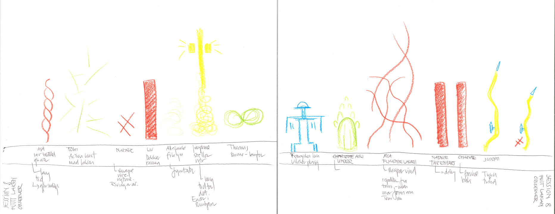 The notation I explored is the drawing of abstract figures in response to actions, emotions, and conceptual ideas. The figures are imprints of being exposed to a nonverbal experience of performing arts. The notations are unique for me and specific to these sessions. Dramaturgical seismography does not aim to be a scientific, universally applicable system; it can inspire others to explore their own way of notation.