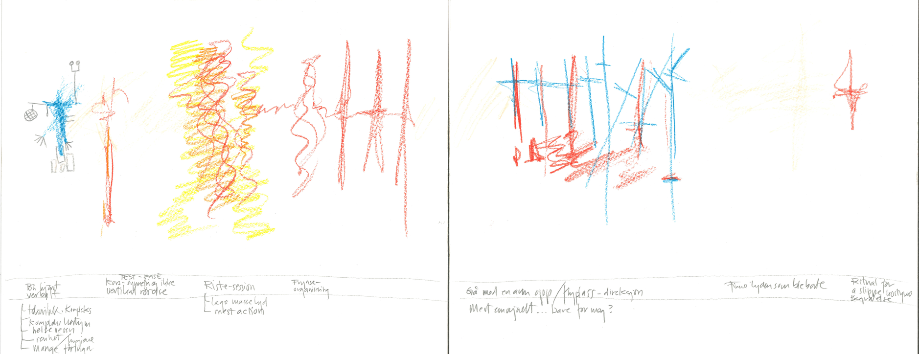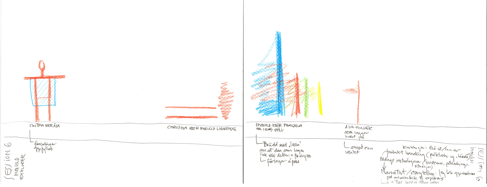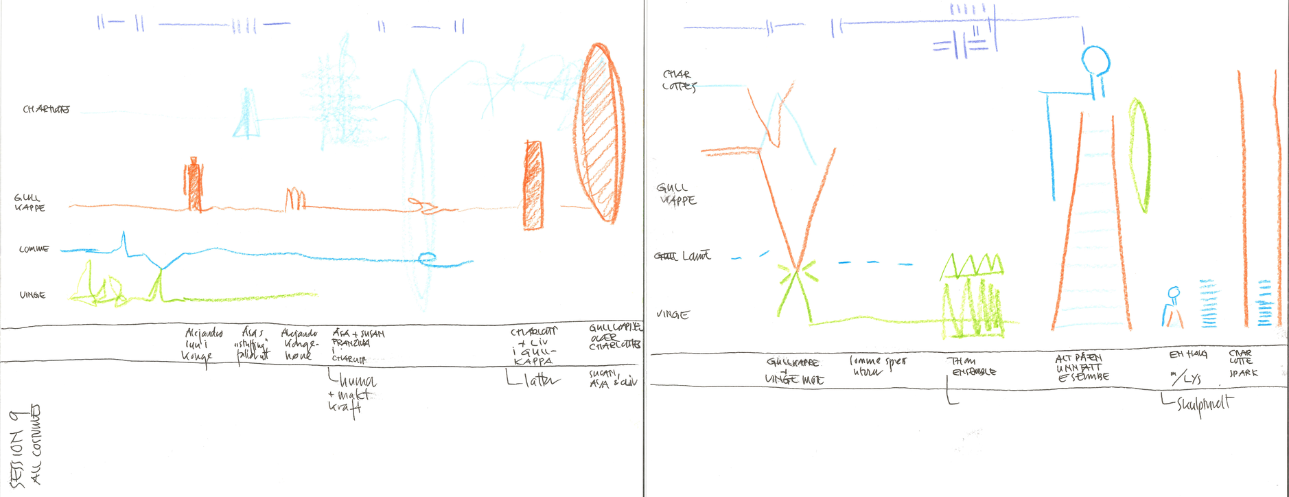 The point in the jam session where this action occurred formed my experience and the quality of the drawings, and thereby also the notation of the dramaturgy of the session. If the action with the costume that was obvious (from a semiotic point of view), like the interaction as a king with a golden cloak, happen at a late point, a tension built up towards this point of revelation, if it happen at an early point in the session, a tension was revealed, and the exploration got into an either deeper or more playful mode. The drawings of the actions that were the most distinct, following or contrasting, resulted in distinct figures.