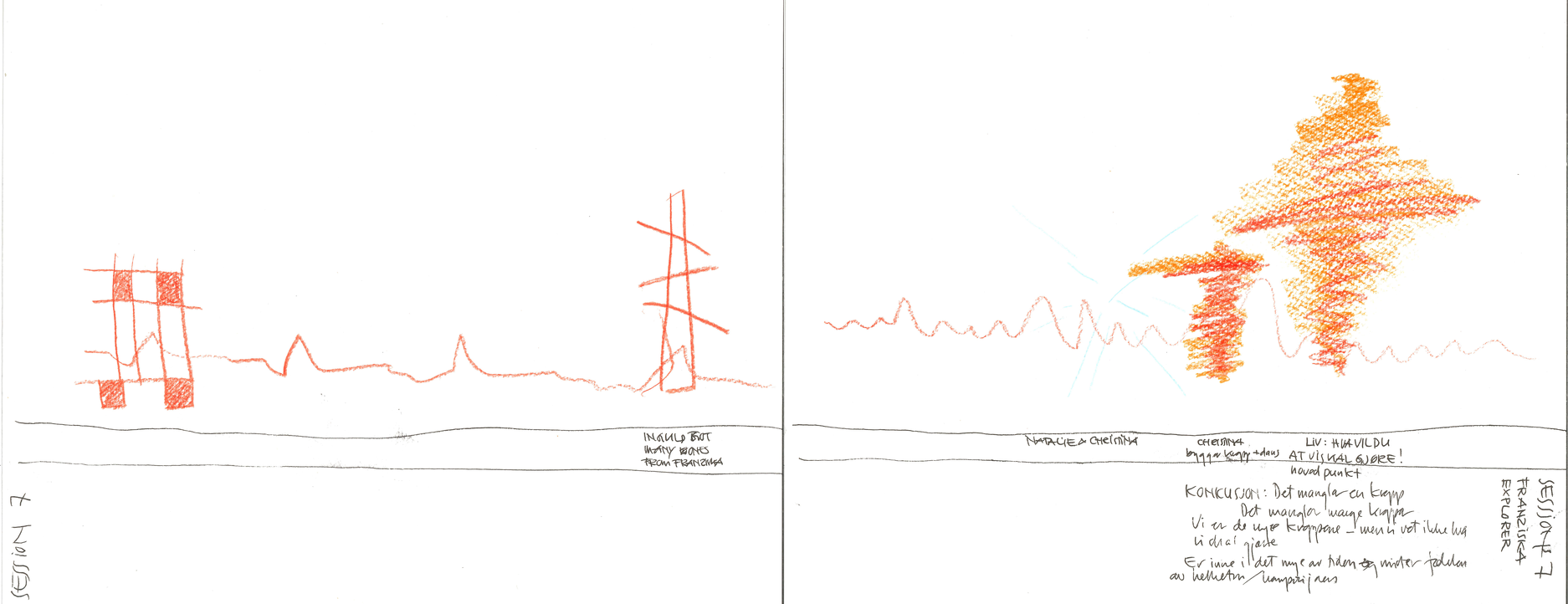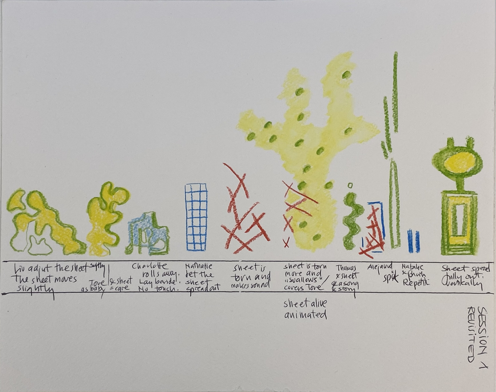 The notation I explored is the drawing of abstract figures in response to actions, emotions, and conceptual ideas. The figures are imprints of being exposed to a nonverbal experience of performing arts. The notations are unique for me and specific to these sessions. Dramaturgical seismography does not aim to be a scientific, universally applicable system; it can inspire others to explore their own way of notation.
