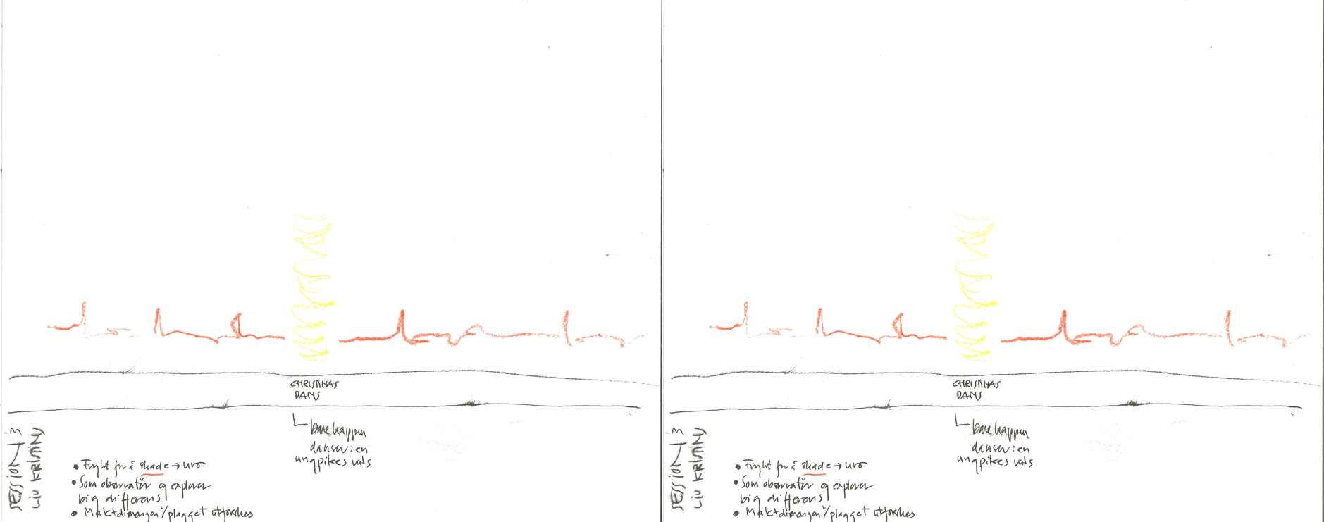 I did not use a specific definition of dramaturgy, beyond a general idea of it as a composition/assemblage of human and non-human scenic elements in events unfolding before an audience. The goal was to intuitively capture, through drawing, the sensations each action and event created in me, and to observe and reflect on the findings from the experiment.