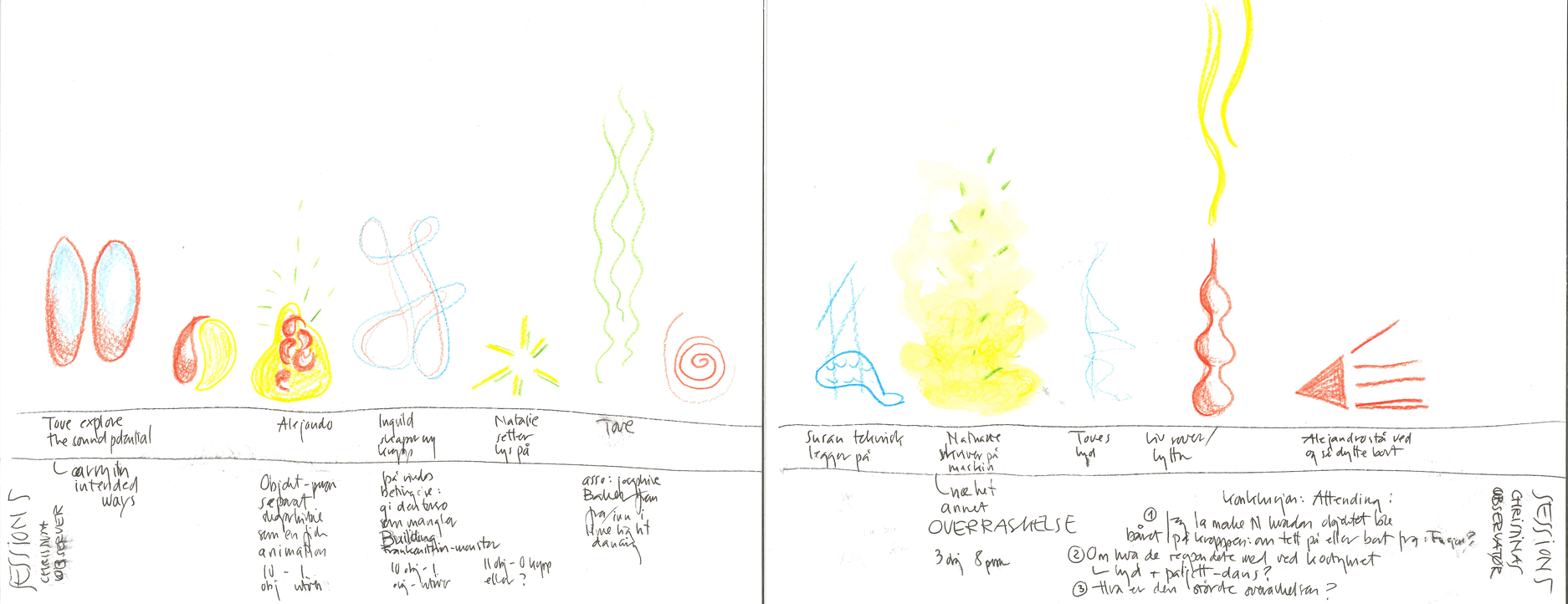 The method can be used in several phases of creating a devised performance, such as registering the improvised sessions, discovering structures, and helping organize and compose with elements. A challenge here can be collaborative work, where several people must co-create, as the visual, abstract language of the figures can challenge communication. On the other hand, this can also strengthen the possibility of communicating, as the language does not prioritize wordy descriptions. During the workshop, in the group discussions that followed the costume jam sessions, the group members responded to my drawings. It was interesting for me to hear from them that the notation captured the actions in a very specific and precise manner.