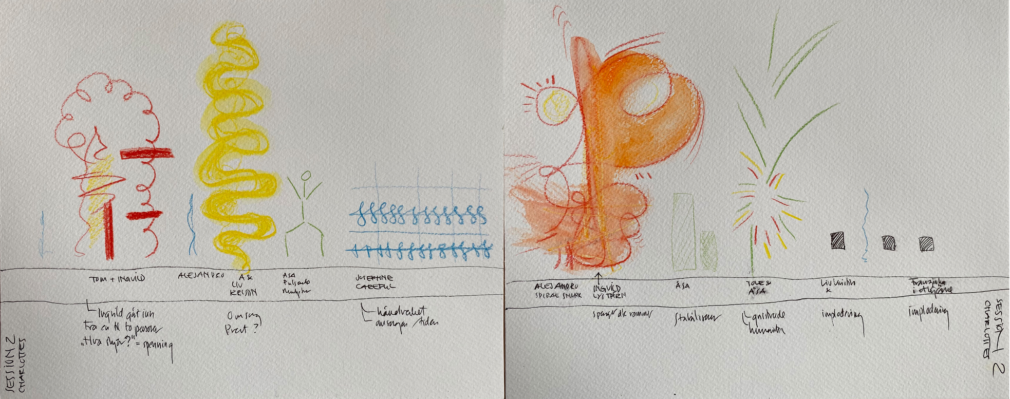 Emotions, moods, dynamics, worlding: Since the seismography was conducted by me as a single person, in a direct and spontaneous manner, the emotional dimension could be registered, alongside other dimensions such as the practical, conceptual, relational, and spatial. Each figure was drawn spontaneously, in less than a minute. This way, I could discover layers of the performance that are not so obvious in the creational process, like emotions, mood, dynamics, and the worlds that the costumes and actions could be part of.