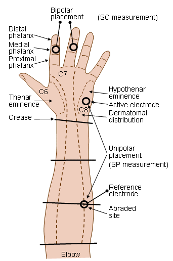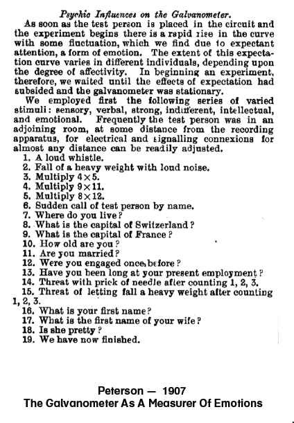 Charles Féré (1888) - in the lab of Jean Charcot - found that, by passing a small electrical current across two electrodes placed on the surface of the skin, one could measure momentary decreases in skin resistance in response to a variety of stimuli (visual, auditory, gustatory, olfactory, etc.). The basic phenomenon discovered by Fere is that the skin momentarily becomes a better conductor of electricity when external stimuli are presented.
