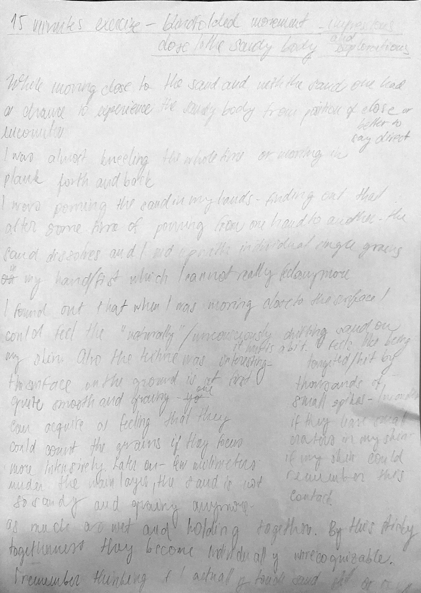 During these four days we were conducting individual site--specific exercises in order to experience together with local sand at the beach and sand dunes of Hoorn and Midsland near by the North sea. We have arrived to this location with a question in mind: What is the sound of sand? What does it narrate? When can we hear sand? In what encounters is the body or the individual audible? How does it sound? Could sand talk and if so, what would they say? Is their knowledge hearable for us?