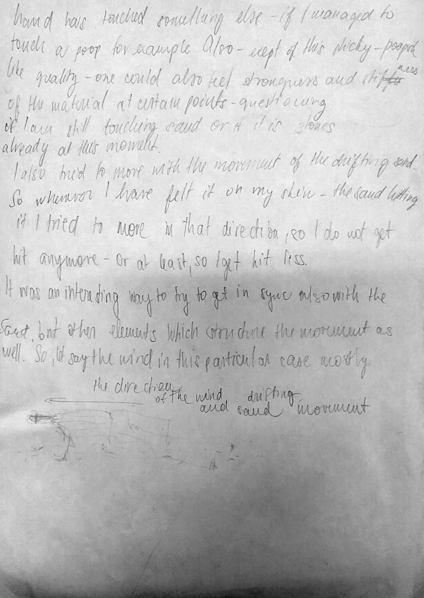 We move with the sand. Blindfolded we move. We move with the sand. Experiencing the environment which they co-create. The environment which they co-form and co-curate. The environment where they move. Blindfolded we move and listen and touch and feel the coldness of strong north wind which carries the drifting grains. We feel them hitting our faces when coming closer to the surface. However we do not leave. We stay. We feel. We move with the sand.