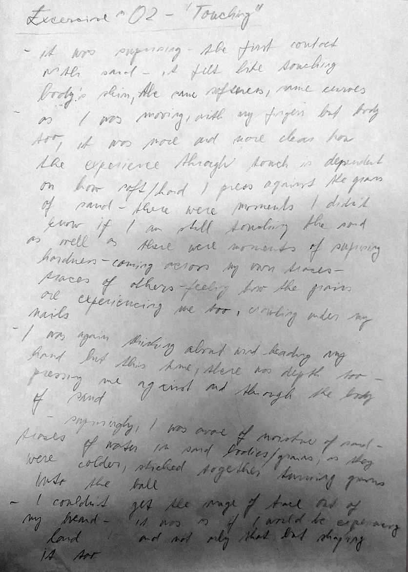 Our body has undergone various exercises for finding strategies to enable focus. Through deep focus to deep listening. These exercises consisted from meditation with the sand, observing the sand and drawing the observed grains as well as bigger bodies, listening to the sand, writing with the sand, moving with the sand, standing with the sand, and observing the grains of sand under a microscope.