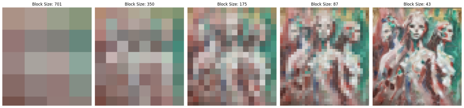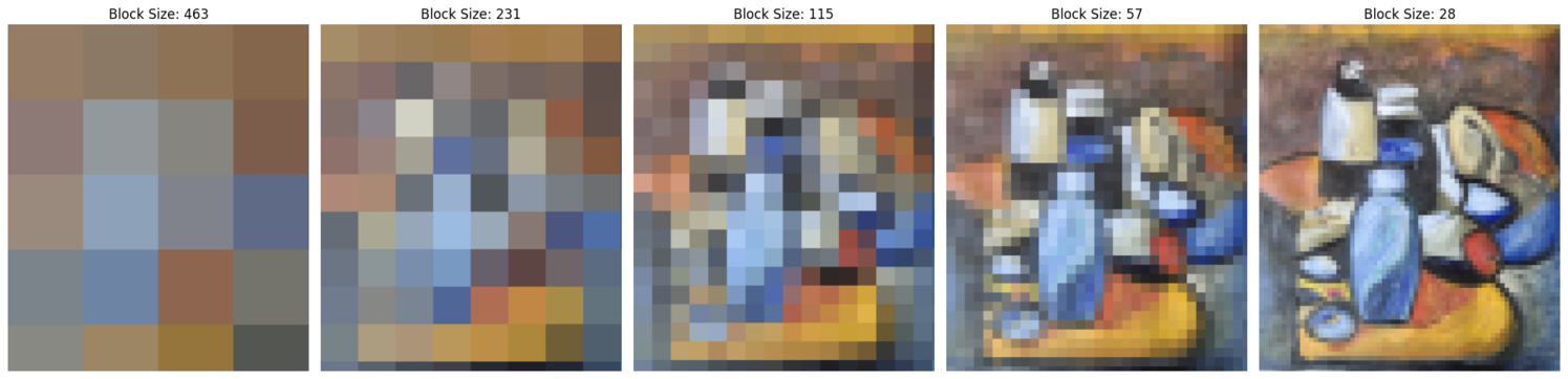 Movements toward description is shown in the video and strip photo. The first canvas in the strip shows large blocks of size 4"x$' or 403X403 pixels. The middle frame with 115x115 pixels shows the emergence of objects that are confirmed by the 4th frame with blocks of size 57x57 pixels.