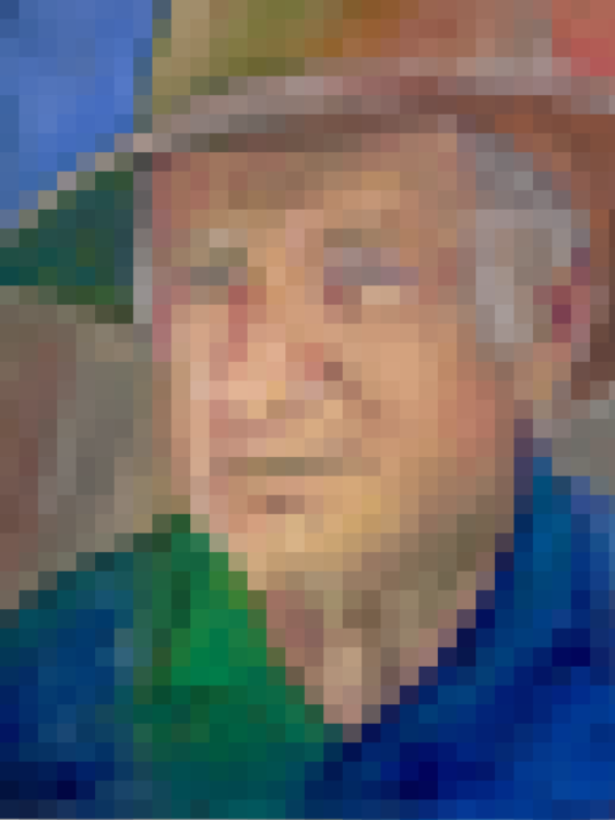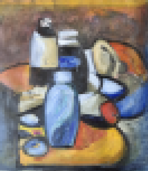 The painting begins with 4" blocks and as they are halved in size the still life objects start to emerge. The painter and the viewer are confronted with the issue of when to stop reducing the size of the blocks and whether the blocks should ramain equal.