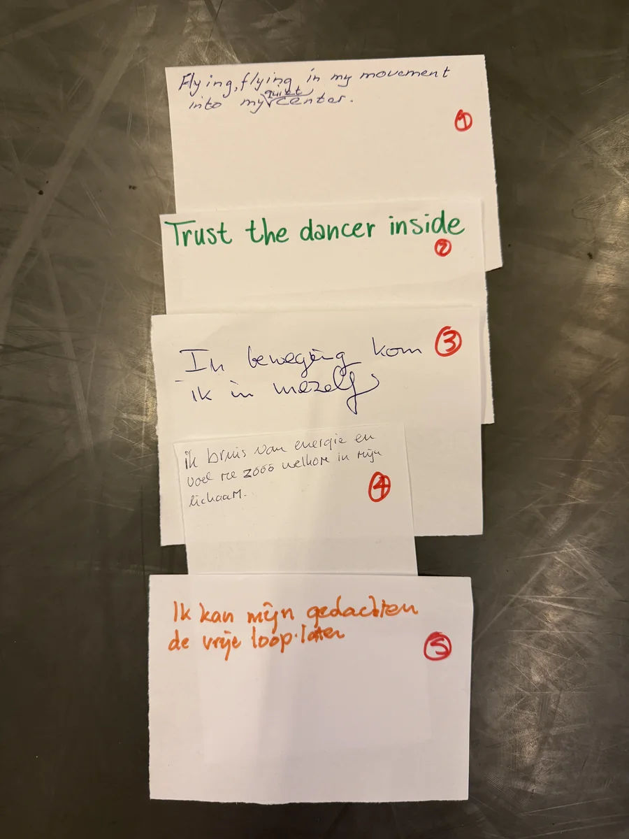 Vliegend, vliegend in mijn beweging vind ik mijn centrum. Vertrouw op de danser in jezelf. In beweging kom ik in mezelf. Ik bruis van energie en voel me zo welkom in mijn lichaam. Ik kan mijn gedachten de vrije loop laten.