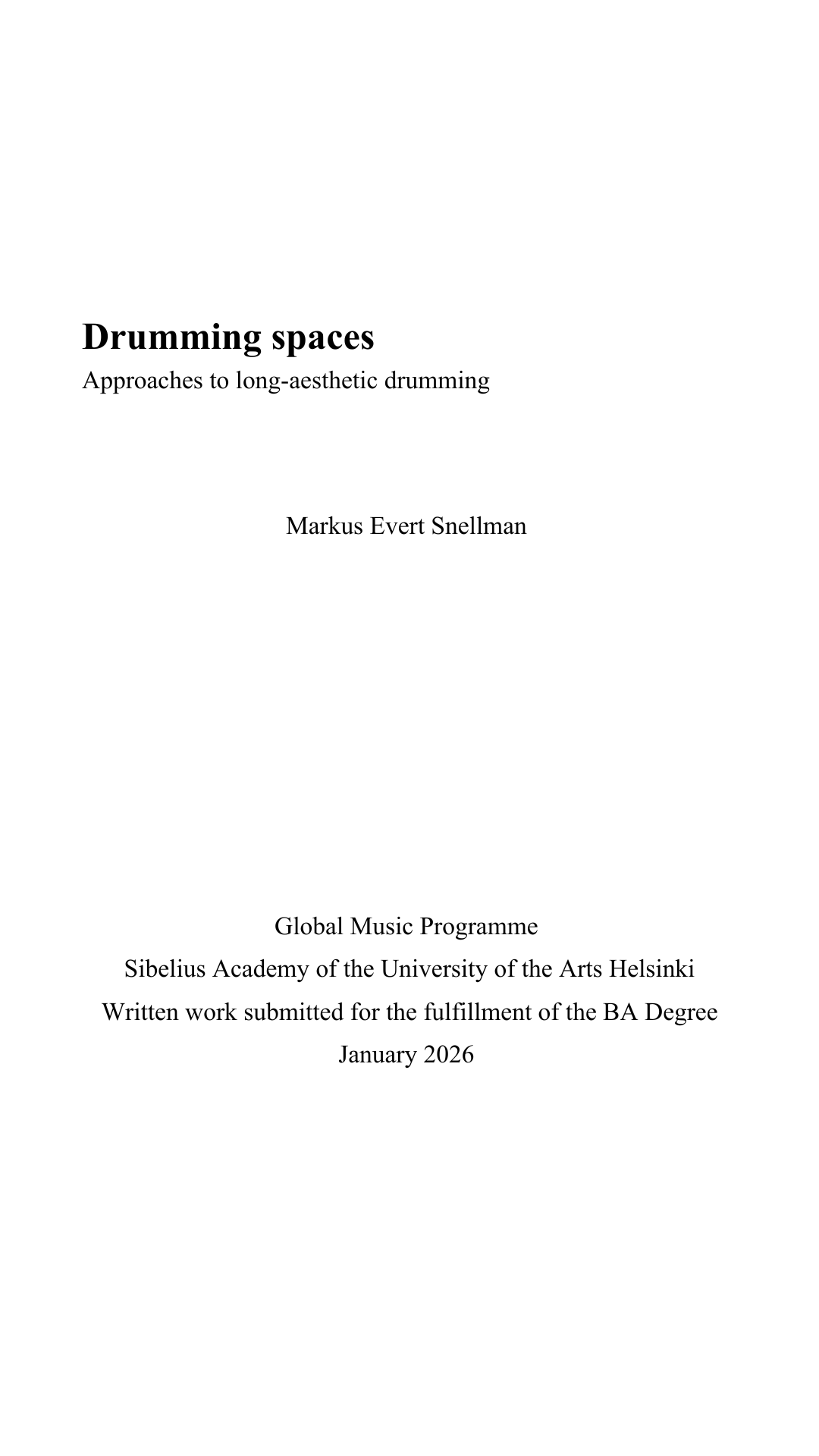 The research draws on Finnish folk music’s pitkä estetiikka (long aesthetic), minimalist music, flow theory, and improvisation literature, and adopts an artistic research methodology in which drumming practice constitutes the primary site of inquiry. Insights are synthesised from personal practice, group rehearsals, performances, and audiovisual documentation produced between 2024 and 2025 in duo and trio improvisational settings, analysed through reflective practice and retrospective video analysis.