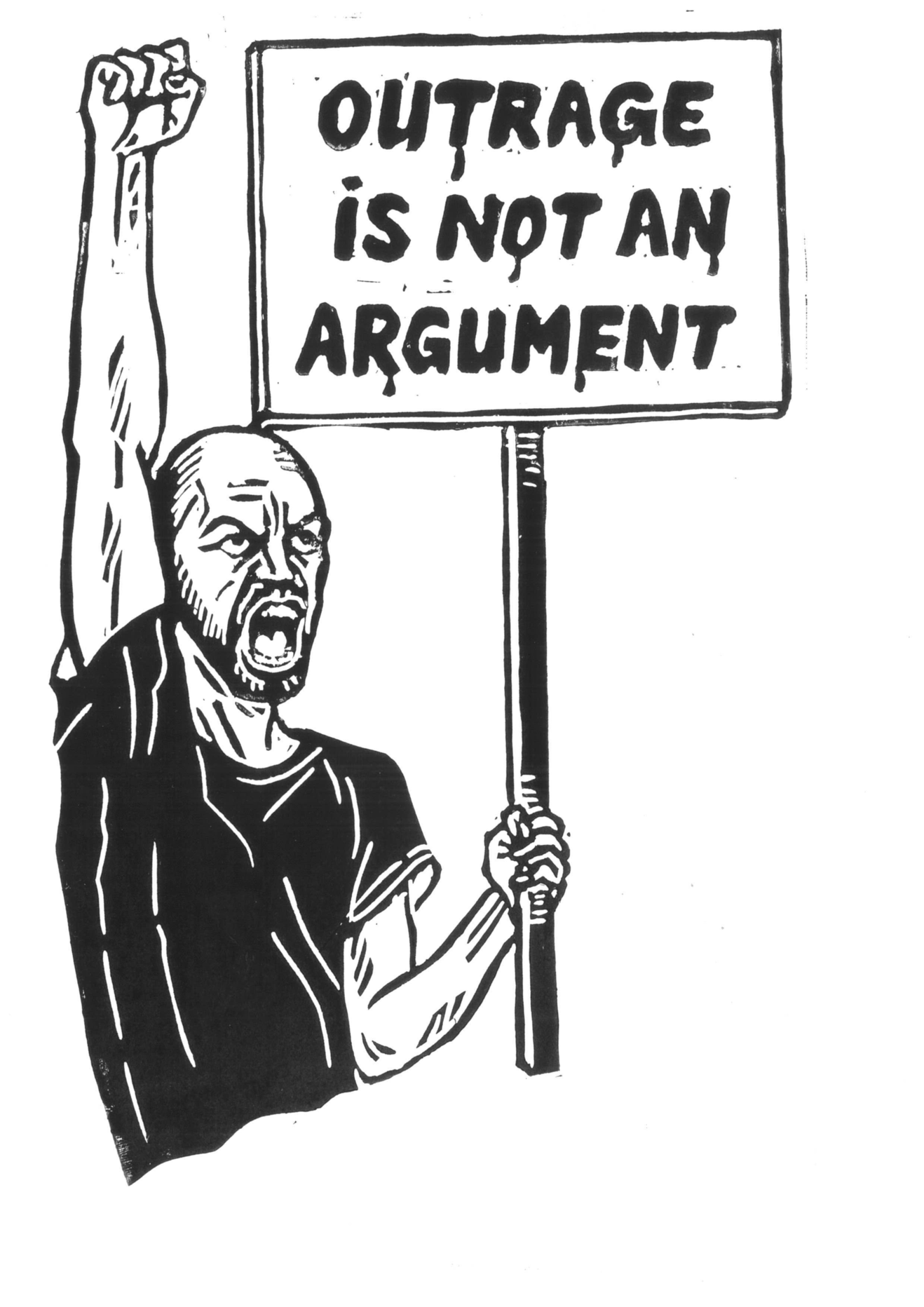 De leeswijzer heeft een schreeuwende Maarten, met protestbord en gebalde vuist in de lucht. Noem het een boze Maarten. De muziek is van Rage against the Machine, Know your enemy (Rage against the machine, 1992). De tekst op het bord is, vrij vertaald, ‘verontwaardiging is geen argument’. Deze quote van Gandhi kreeg ik, samen met het boekje van Stéphane Hessel, Neem het niet! (Hessel, 2010/2011) als tip van Jan Schoolmeesters (J.Schoolmeesters, persoonlijke communicatie, 29-10-2025). Het ging na portfolio twee en in de midterm assessment over het feit dat ik boos ben, of boos over kom. Ik wil dat toch wel even verduidelijken want, hoewel ik de feedback snap, gaat het nu wel heel erg een eigen leven leiden. Wellicht ook door mijn uitspraken in de lessen die, zoals ik het zelf dan ook aanduid, wat zwart-wit zijn zoals de linosneden. In mijn carrière bij mijn huidige werkgever kreeg ik in het begin vaak de kritiek dat ik me vaker moest laten horen. Iedere keer als ik solliciteerde voor een zogenaamde LC of LD functie was dat de feedback. Wanneer ik het idee heb dat ik weet ‘hoe de hazen lopen’ dan pas laat ik mij gelden. Ik snap de tips van Jan Schoolmeesters dan ook. Laat je verontwaardiging gepaard gaan met (tegen)argumenten. Zo las ik dus het boek van Stéphane Hessel, een document waarin hij zijn visie over wat hij vindt dat er fout gaat in de wereld onderbouwt met de nodige argumenten. Activisme, maar wel met een duidelijke onderbouwing.