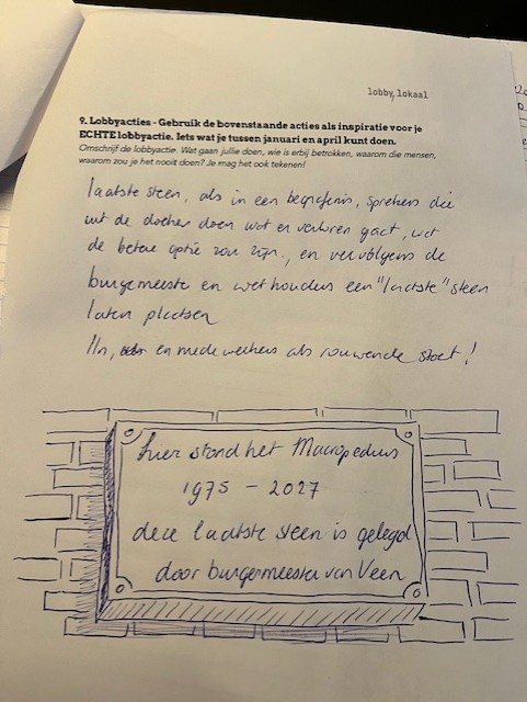 Het gesprek met Wilmie Steeghs, de wethouder die de plannen voor nieuwbouw in gang heeft gezet maar later sneuvelde op deze portefeuille en tevens oud-leerling van onze school, vond plaats op vrijdag november (W.Steeghs, persoonlijke communicatie, 28-11-2025). Ik had haar graag gesproken bij mij op school, maar dat liet haar agenda niet toe dus spraken we elkaar op het gemeentehuis. In dit gesprek heb ik met haar ook twee onderdelen uit de workshop behandeld. Als ik dit gesprek moet typeren dan was het vooral, op z’n Brabants, gezellig. Wilmie liet nooit het achterste van haar tong zien waren mijn gedachten en sommige antwoorden op mijn vragen bleven wat op de vlakte. Wat ik wel fijn vond was, dat zij aangaf dat als er woningen komen op de plek van ons huidige gebouw er dan ook een deel beschikbaar komt voor sociale woningbouw. Wanneer ik vroeg naar de maatschappelijke taak van de gemeente als het gaat om duurzaamheid, kwam er een heel politiek antwoord over hoe de gemeente omgaat met duurzaamheid, maar een echt antwoord kwam er niet. Ze begreep mijn visie en argumenten en ze gaf aan dat er zo veel belangen speelden in dit politieke spel. In mijn workshop had ik ook een van de raadsleden, Yorick van Lieshout van de Dorpspartij Gemert-Bakel, ook de partij van Wilmie Steeghs, aan tafel. Hij gaf aan dat het behoud van een Havo/VWO school van belang was voor de leefbaarheid van de gemeente Gemert-Bakel en dat de school dan ook toekomstbestendig moest zijn. Dat vond ik een goed argument, al kan dat in mijn optiek ook met een goed verbouwde/gerenoveerde school die vervolgens Gemert op de kaart zet, zoals ook met andere projecten van Mevrouw Meijer (stichting die pleit voor renovatie i.p.v. nieuwbouw) is gebeurd. Mijn argumenten strandden dus een beetje in politiek correcte antwoorden en dat vond ik jammer. Dat politieke spel vind ik nog steeds lastig, vandaar ook de workshop van Kunstloc waar ik later over vertel. Toen ik Wilmie vroeg wat zij van het gesprek vond was de uitkomst dat ze mij begreep vanuit de onderwijskundige visie die ik op tafel legde en vond ze de oefeningen vanuit de workshop erg waardevol want die verhalen mogen niet verloren gaan.