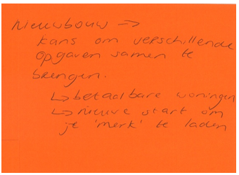 Het eerste gesprek dat ik had was met de huidige wethouder, Hanneke Coppens (H.Coppens, persoonlijke communicatie, 29-10-2025), die het dossier van ons schoolgebouw dus in haar takenpakket heeft. Zij nam deel aan mijn workshop op woensdag 29 oktober 2025, omdat zij, naast de verantwoordelijk wethouder, ook oud-leerling van onze school is. Ik vond dit het lastigste gesprek. In mijn workshop merkte ik zeer sterk, zeker toen ik vertelde over mijn visie en mijn argumenten, ik alles heel erg op een weegschaal aan het leggen was. Dat ik veel minder vrij sprak. Ik begon iedere workshop met de vraag wat de deelnemers zouden doen als zij mochten bepalen wat er met het schoolgebouw moest gebeuren en waarom. Het antwoord van de wethouder lees je op het oranje kaartje. Ik las dat en merkte dat ik aardig in de weerstand schoot. Met name het laatste argument. “Een nieuwe start om je merk te laden.” druist tegen alles in van wat ik denk dat onderwijs moet zijn. Ze ziet een school als een bedrijf, want ze bedoelde letterlijk dat we het Macropedius opnieuw in de markt konden zetten. En de school als bedrijf staat zo ver weg van mijn onderwijsvisie dat ik een paar keer moest slikken. Toch hield ik me voor om open te blijven staan voor de ander. Na de workshop hadden we nog een (informeel) gesprek met elkaar terwijl iedereen zich boog over de uitkomsten van de workshop. In dit gesprek gaf ze aan dat de verhalen, het onderdeel waarover mijn workshop gaat, voor haar niet in het gebouw zitten, die herinneringen had ze toch al. Ik gaf aan dat ik dat wel vreemd vond, aangezien ze in het begin van de workshop aan het worstelen was om een verhaal op papier te krijgen en nadat ze terugkwam van een wandeling door het gebouw (onderdeel in mijn workshop waarbij ze in duo’s een plek bezoeken waar een verhaal aan vasthangt), druk kletsend en wijzend met een andere deelnemer, daarna zelf zei dat ze nu zoveel verhalen kon optekenen. Volgens mij doet het gebouw dan ook iets. Daar keek zij toch anders tegenaan. Toen werd het verhaal abrupt onderbroken door haar telefoon en volgende afspraak. Ik heb daarna nog om feedback gevraagd op dit punt door haar een mail te sturen, maar die bleef, tot tweemaal toe, helaas onbeantwoord.