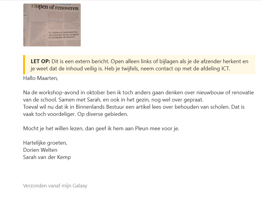 Ter afronding heb ik vanuit mijn workshops voor mijn onderzoek nog een mooi voorbeeld van hoe ik binnen mijn werkpraktijk laat zien dat ik bijdraag aan de bredere kunsteducatieve- en maatschappelijke discussies. Ik vertelde in die workshops ook kort over mijn workshop en over scholenbouw in Nederland. Ik vroeg deelnemers op te schrijven wat zij met ons schoolgebouw zouden doen, mochten zij het voor het zeggen hebben. Van Dorien Welten, oud-leerling en moeder van een huidige leerling kreeg ik onderstaande mail terug. Dus in plaats van alleen de verontwaardiging heb ik hier de argumenten laten spreken.