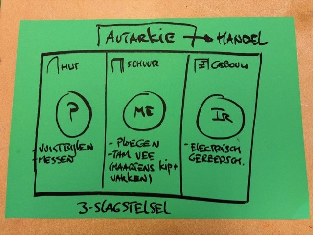 Tijdens de workshop tekende een van mijn collega’s van het vak geschiedenis bovenstaand idee voor de tuin. Een drieslagstelsel, dit is een landbouwmethode uit de vroege Middeleeuwen. Hierbij werden de akkergronden of “kouters” in drie stukken verdeeld, in plaats van twee, zoals dáárvoor gebruikelijk was. Elke slag kent een opeenvolgende bezaaiing met winterkoren in het eerste jaar en zomerkoren in het tweede jaar, terwijl het gedurende het derde jaar braak ligt. De natuur kan zich in dat derde jaar dus regenereren. Zijn idee was om het eerste veld op een prehistorische manier te onderhouden, de tweede met middeleeuws gereedschap en de derde industrieel. Tijdens de evaluatie met de andere collega’s kwam al snel de opmerking dat het derde veld niet bepaald regeneratief zou zijn als je er industrieel te werk zou gaan. Het leverde dus mooi discussies op en iedereen kwam wel met lessen voor zijn of haar vak in de tuin.