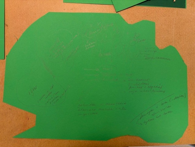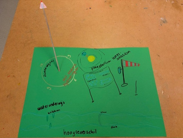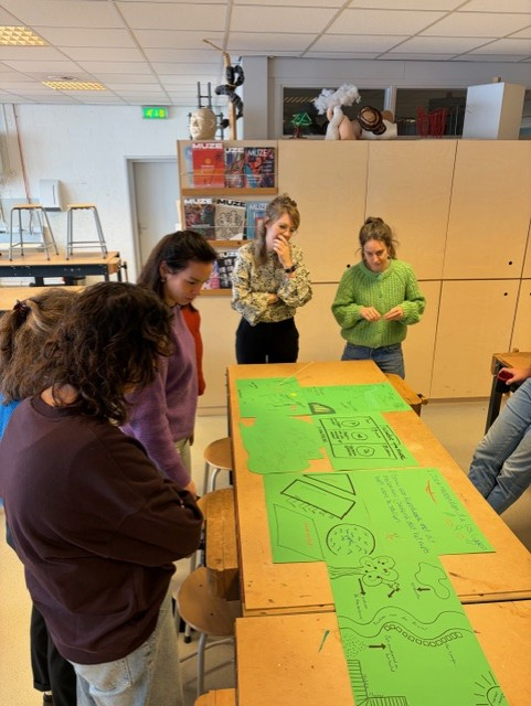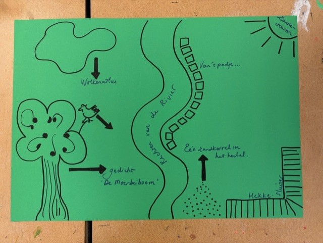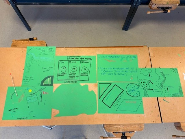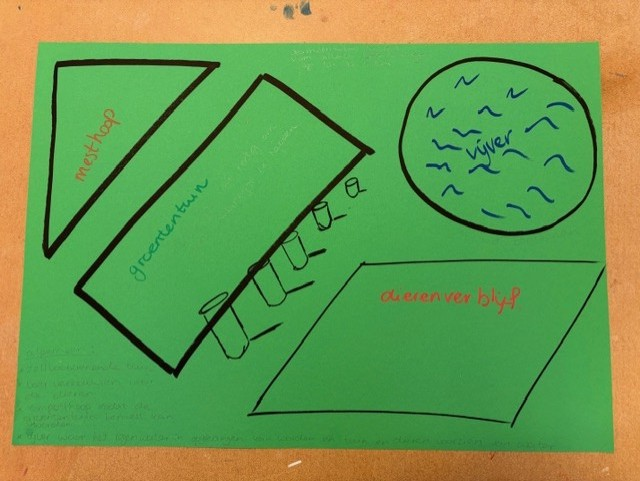 Ik begon mijn workshop, deze was direct na de vakantie, met een check-in, deze hadden we tijdens een van de lessen van Mirjam van Tilburg gehad. “Als je je huidige toestand moet vergelijken met iets uit de tuin, wat zou dat dan zijn?” Vervolgens gaf ik een inleiding over hoe regeneratief onderwijs op mijn pad gekomen was en wat regeneratief onderwijs nu precies is. Best lastig want ik vind het zo nu en dan best breed en veelomvattend met overal wel een soort van rode draad. Vervolgens vertelde ik over de nieuwe locatie en de tuin en gaf ik iedereen een groen vel en liet vaksecties bij elkaar zitten. Ik wilde dat ze nadachten over hoe ze een les konden verzorgen rond of in de tuin, waarbij de leerlingen ook echt met hun voeten in de klei moesten staan en of ze dit wilden tekenen en plakken op dat groene vel. Vervolgens legde ik al deze vellen samen tot een grote tuin en dat werd het eindproduct.