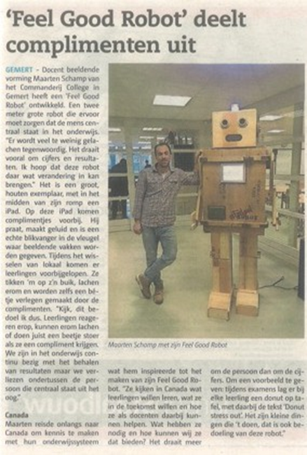 De Feelgoodrobot is gebouwd voor leerlingen, die er doorheen zitten, om een compliment op te halen. Swipe over zijn buik voor een compliment of laat hem er een vertellen. Op zijn borst zitten twee “badges.” Een die de visie van onze vaksectie uitdraagt, cijferloos onderwijs (jij als leerling bent meer dan een cijfer) en een die vraagt om te bewijzen dat je geen robot bent. In mijn onderwijspraktijk probeer ik een omgeving te creëren waarin leerlingen zich gezien voelen en waarin aandacht is voor welzijn naast de enorme prestatiedruk die nu het onderwijs beheerst. In het boek “Door kunst onderwezen willen worden” (Biesta, 2017, pp. 57, 58) schrijft Biesta hierover dat we leerlingen zijn gaan zien als objecten die gunstige opbrengsten voor het onderwijssysteem moeten genereren en dat de kunsten hier een uitweg aan bieden.