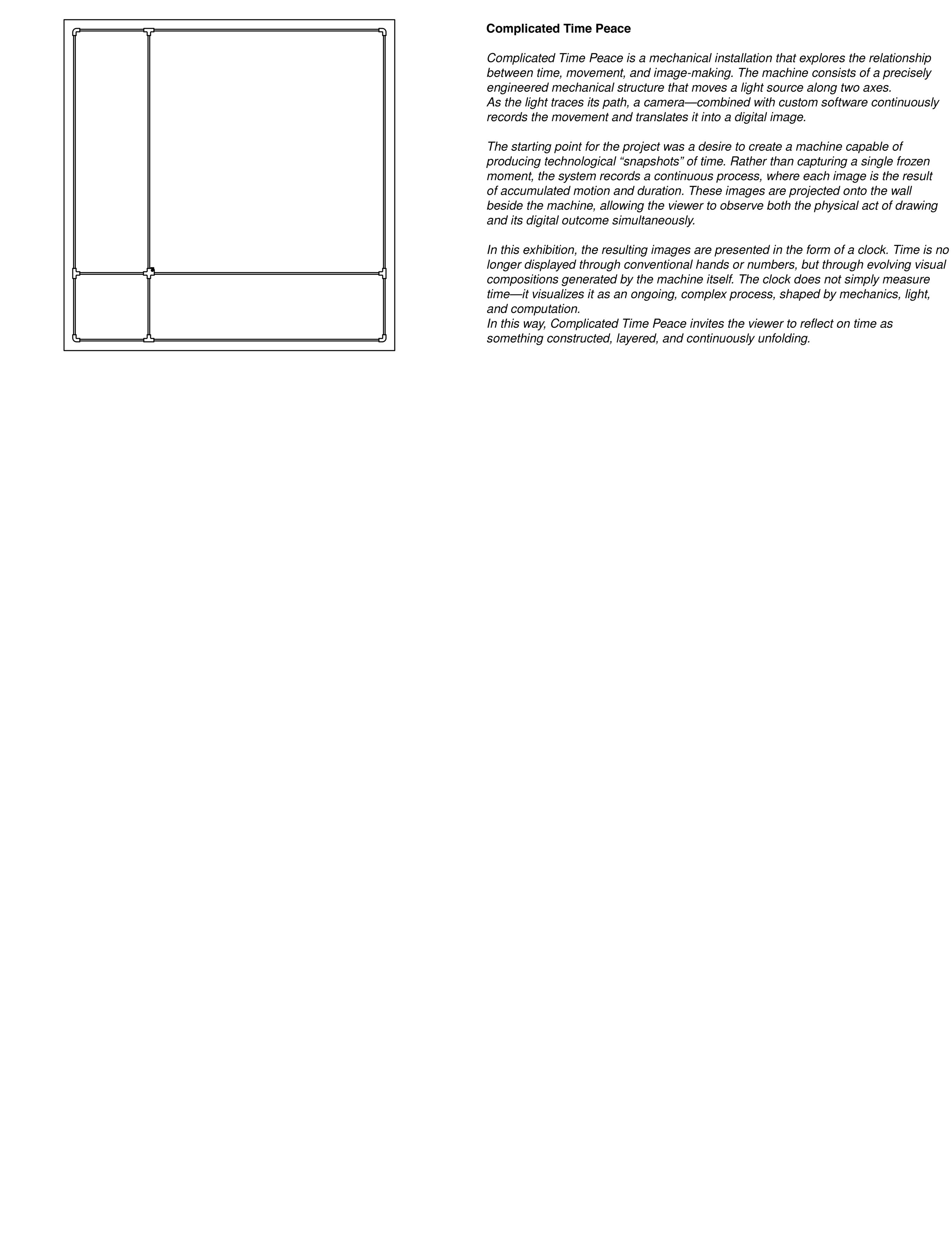 Complicated Time Peace is a kinetic installation that visualizes time through light, mechanical movement, and computation. A custom-built system generates accumulating images that embed duration rather than capturing singular moments. Presented as a clock, the work reframes time as a continuous, generative process rather than a linear measure.