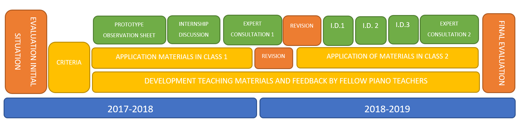 Plomp furthermore explains that educational design research is cyclical in character: “analysis, design, evaluation and revision activities are iterated until an appropriate balance between ideals (‘the intended’) and realization has been achieved” (Plomp 2013, 17). The design process of the teaching materials did not start with systematic analysis of the problem but with a more informal evaluation of the initial situation. After this, I put together a set of criteria for the teaching materials (attached in appendix 3) and designed a prototype of the teaching materials based on them. Next, I asked a group of seven fellow piano teachers for feedback on this prototype by means of a questionnaire, which is attached in appendix 4. I used the prototype in my methodology course and wrote down my usage experiences in a logbook. Furthermore, I asked students for their experiences with the materials. Finally, I improved the materials based on these sources of feedback at the end of both cycles of my research.