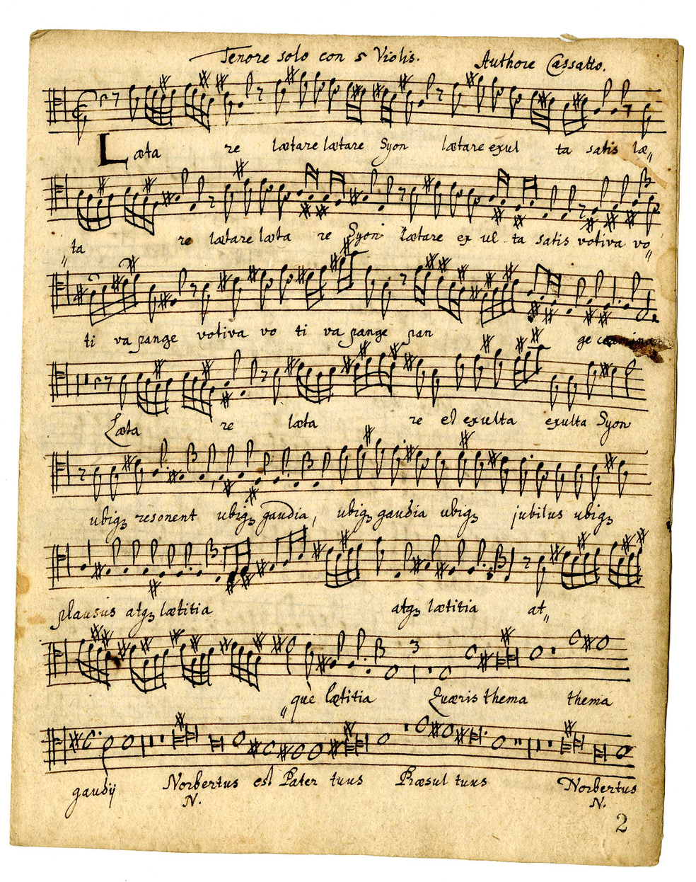 Page one of three of the tenor voice part in manuscript of Laetare Syon by Gasparo Casati (ca 1610-41)