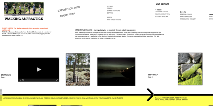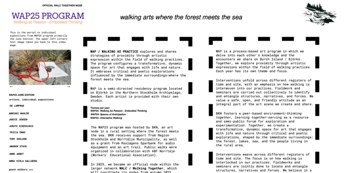 WAP23 curated by Berg Duo a constallation with Ami Skånberg and Anna Viola Hallberg for WAP24 they invited John Schuerman and Antonia Aitken as co-curators. WAP25 was a transformative year and also the first off island walks for this we formed WAPC a coallition of interchanging artist who support each others practices as well as do works together. WAP25 April Edition taped in to the them of Supermarket Art Fair 2025 - Passion with Johen Schuerman as co-curator. For the June Edition it became Walking with Passion - Embodied thinking brought together by Anna Viola Hallberg. Later the summer of 2025 WAPC became part of WALC Together an initiative supported by a European Union grant.